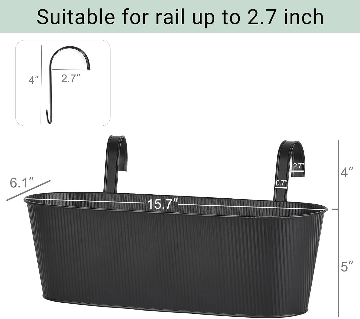 - Note: The package includes three planters and six hooks. Planter is 15.7" x 6.1" x 5". Hook is 4" x 2.7” x 0.7"(Suitable for rail up to 2.3 inch). you need to install the iron bucket yourself when it arrives.