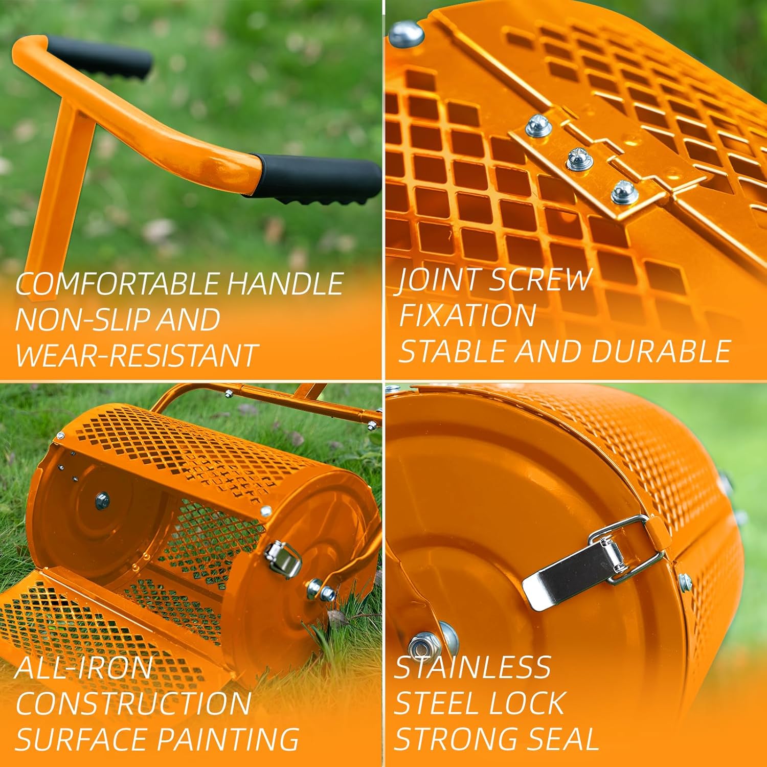 - 【Double-Side Latches Design】 This metal mesh lawn spreader is equipped with 2 side latches to keep the drum surface smooth during operation, preventing any jamming. It serves as a compost spreader for the lawn, ensuring stability, avoiding wear or tear, and being long-lasting and durable.