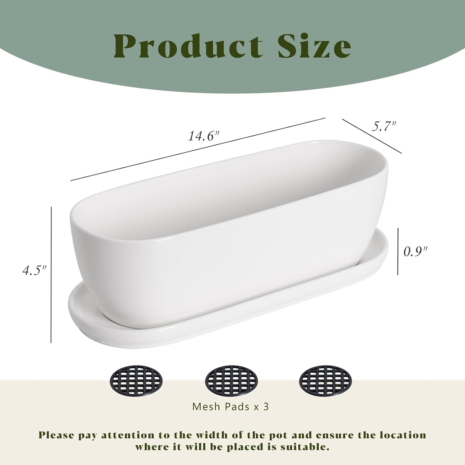 - INDOOR OUTDOOR CERAMIC POTS: 14.6’’ in length, 5.7'' in width, and 4.5’’ in Height. Great for decorating windowsills, tabletops, shelves, bedrooms, kitchens, gardens, and outdoor patios. Smooth inner finish for easy cleaning