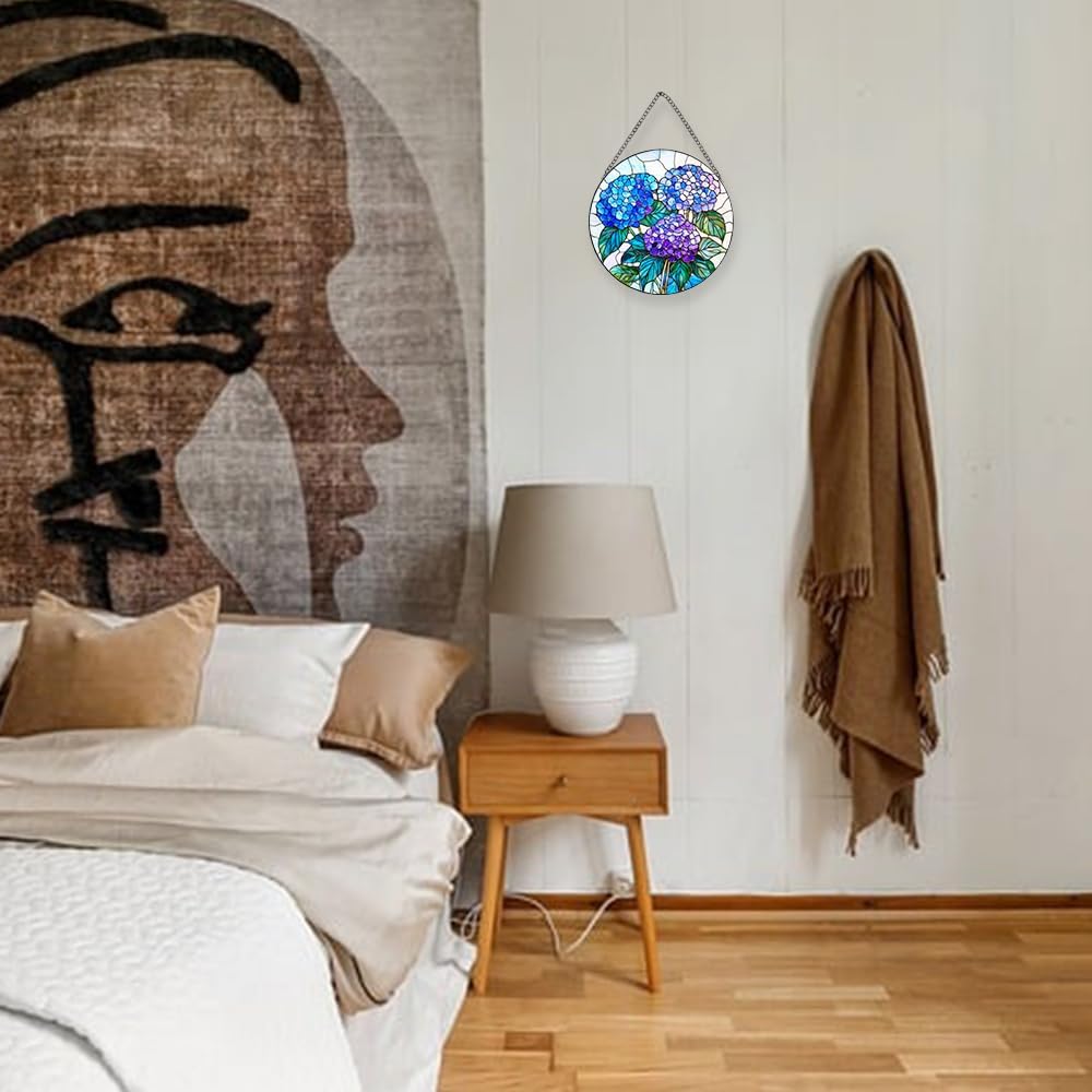 - [Stained Glass Window Hanging]This is a very beautiful hydrangea decor suncatcher with a size of 8x8 inches which is perfect for windows, adding a touch of color without obstructing the view outside. This piece of glass was cut individually and painted by hand. It is skillfully handmade, and it is real glass, NOT plastic or acrylic.