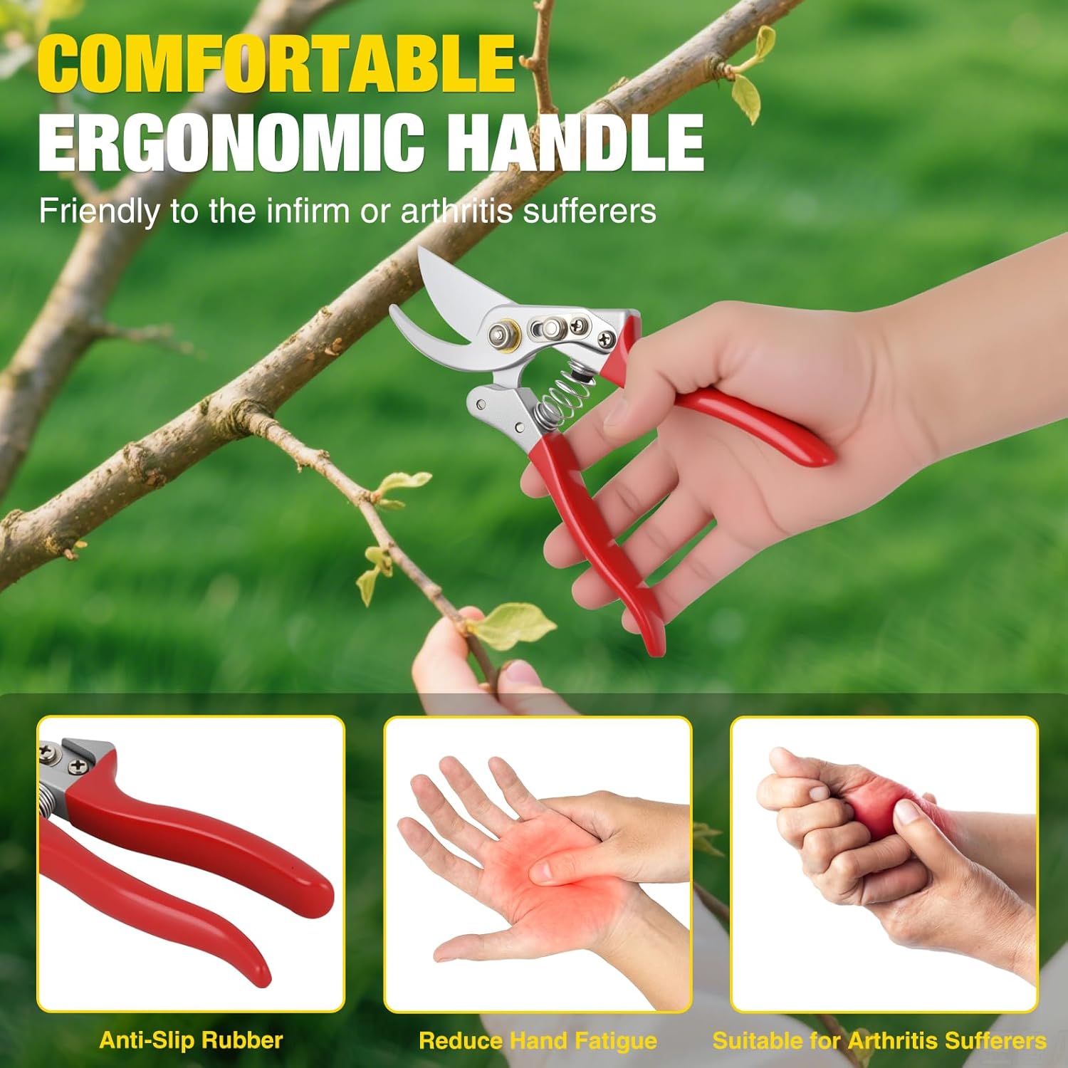 - COMFORTABLE ERGONOMIC HANDLE: The shears gardening tools uses an aluminum alloy handle and non-slip PVC dipped plastic, which is safer and more comfortable, reduces hand fatigue, and is suitable for the elderly and arthritis patients. This pruning shear is suitable for pruning various plants, flowers, picking fruits and vegetables, etc. It is an ideal gift for family, friends and gardening enthusiasts