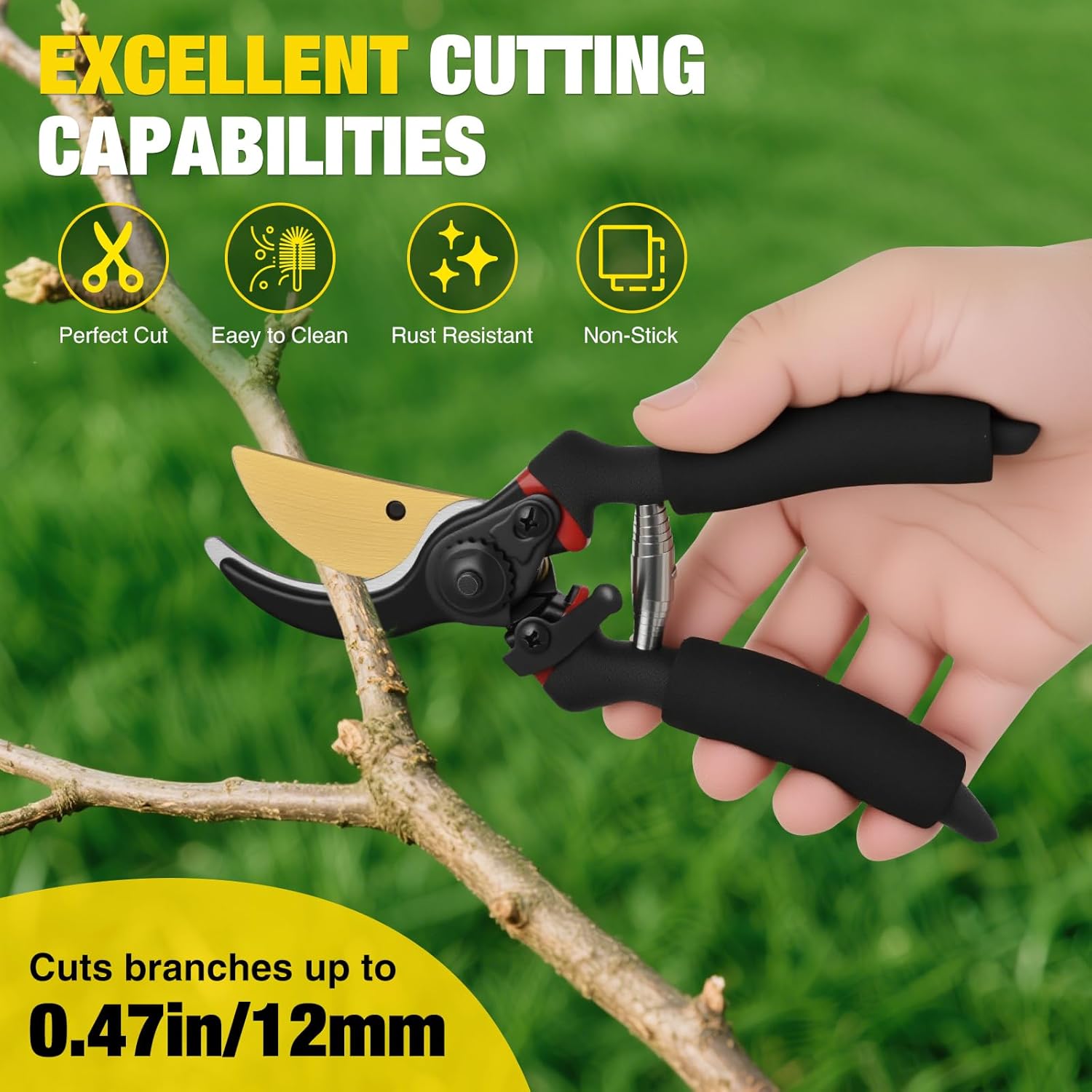 - POWERFUL LOCKING MECHANISM: Our pruning shears for gardening are equipped with a safety lock, which allows you to easily lock and close the blades securely with one hand when not in use, preventing the blades from accidentally opening and causing injury. Whether you carry it in your pocket or tool bag, it provides convenience and peace of mind. Our garden shears pruning are safe and convenient to meet all your gardening needs