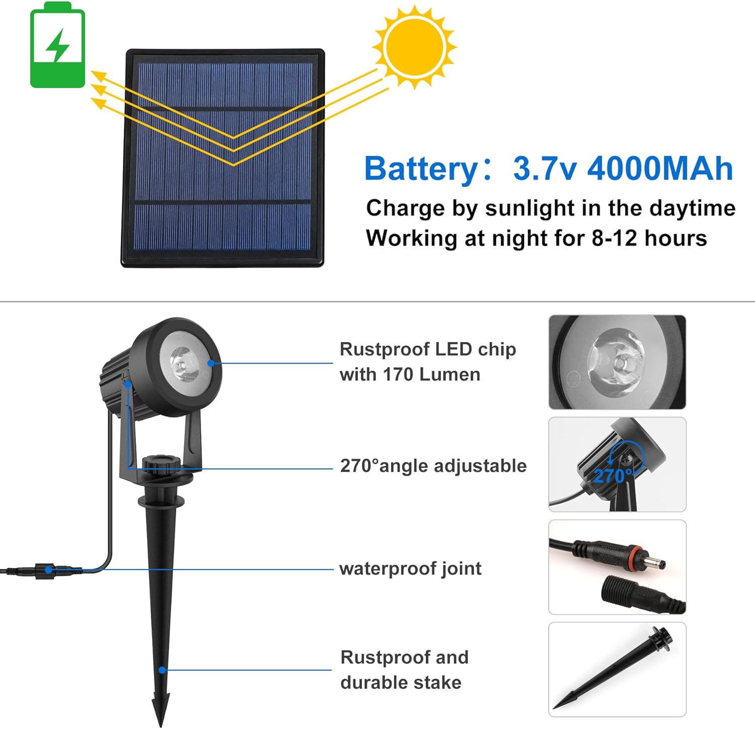 - 2-IN-1 Installation: Solar panel and lights can be mounted on the ground or on the wall with the included screws. Each spotlight comes with 118 inches/3m cable, which can be freely adjusted up and down by 270° to meet different requirements