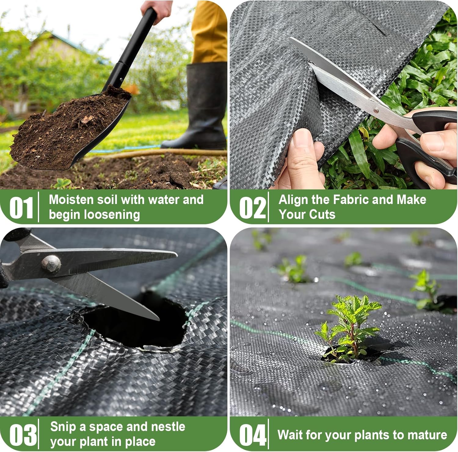 - 【Easy to Cut & Install】This weed control fabric makes installation easy for anyone. With visible green guidelines for precise cutting and alignment, you can unroll and cut it to fit any size or shape in minutes, no special tools or expertise needed.