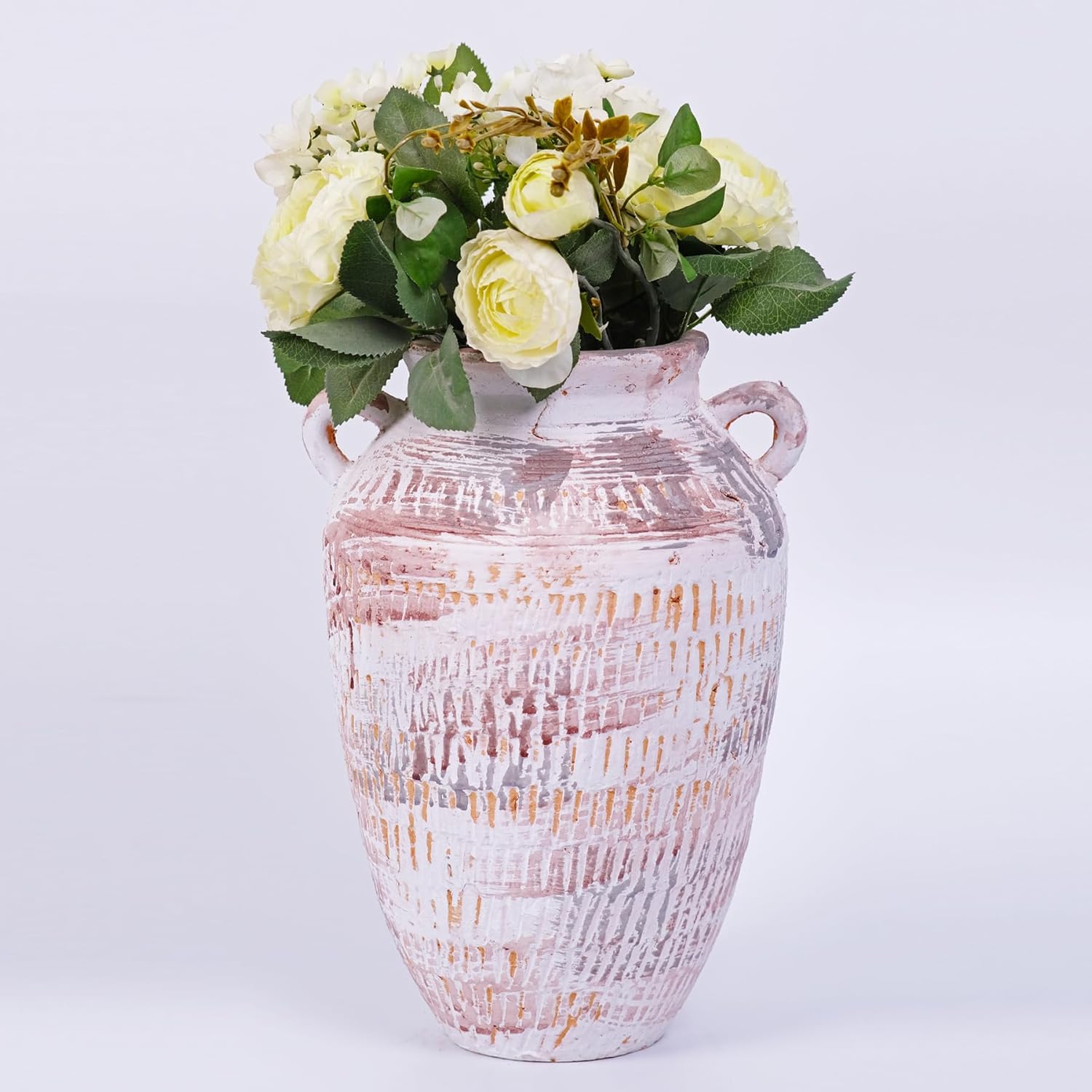 Vintage Ceramic Vase with Handles, 12.6" Height Distressed White & Brown Crackle Finish Planter, Handmade Pottery Flower Vase for Home Decor, Farmhouse, Boho Indoor Decor, with Waterproof Liner
