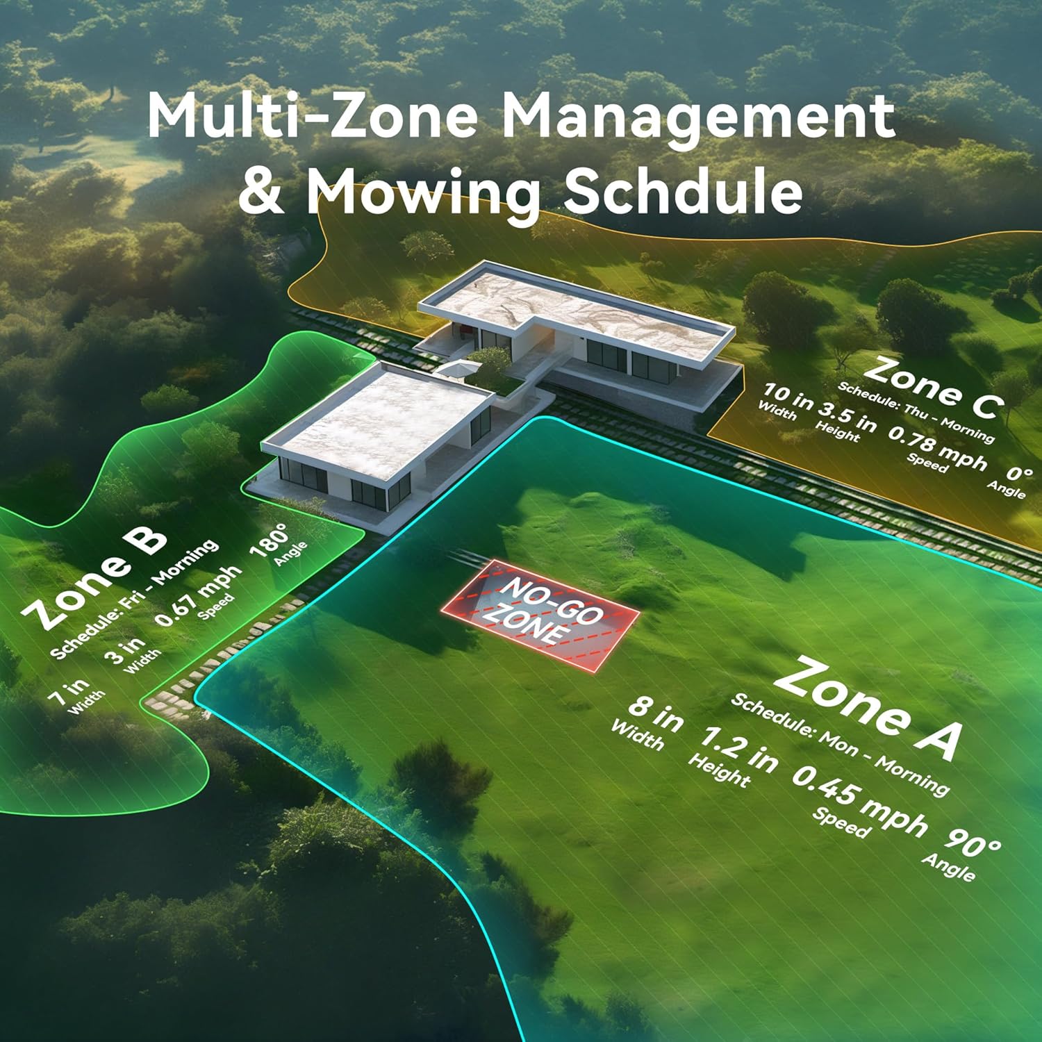 - 【1.5 Acres. Yes. Just One Mower】Thanks to powerful vision and spatial fusion technology, the mower can "understand" its surroundings like human eyes. It supports edge mapping of up to 1.5 acres (65,340 sq.ft / 6000㎡) and ensures consistently centimeter-accurate positioning. Users can customize multiple working areas via the app and define no-go zones such as pools, flower beds, and play areas, all of which are accurately recognized. Daily lawn care becomes effortless with the schedule function.
