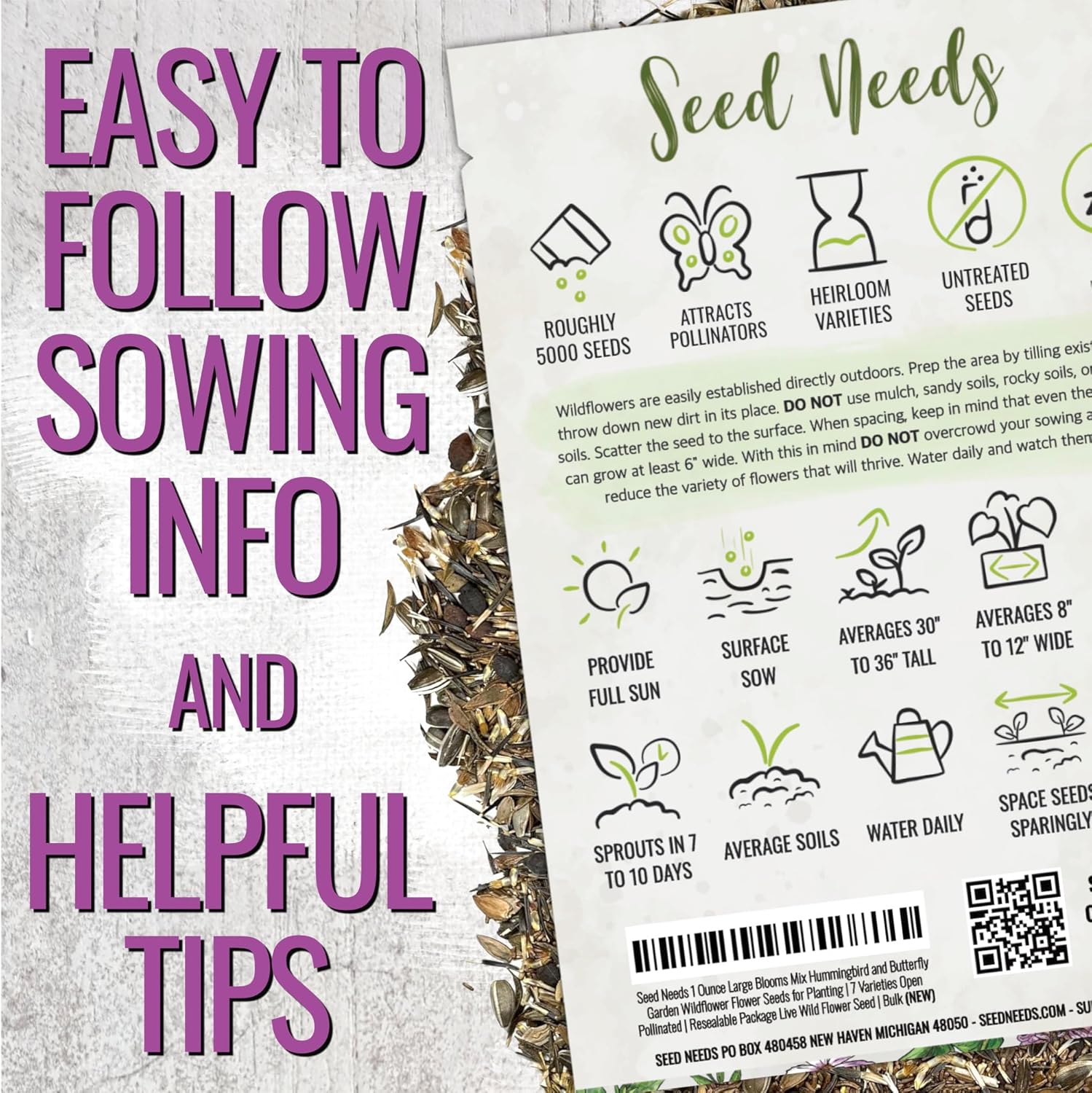 Seed Needs Garden Flower Seeds Large Blooms Mix Hummingbird and Butterfly | 2 Packs (1 Ounce Each) No Filler 7 Varieties Open Pollinated | Resealable Package Live Wild Flower Seed | Bulk