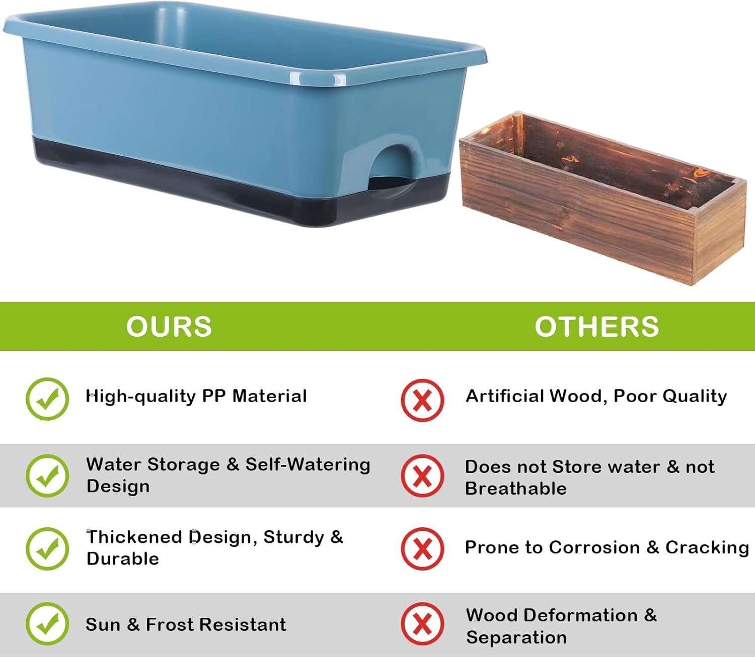 - 【Premium & Durable】The planter pots are made of high quality PP material and has been thickened to bear up to 300KG (660LB). This window box planter is sturdy, wear-resistant and durable. It can be exposed to light, wind, and sunlight for long periods of time, with a lifespan of decades. It is an excellent planter box for both indoor and outdoor.