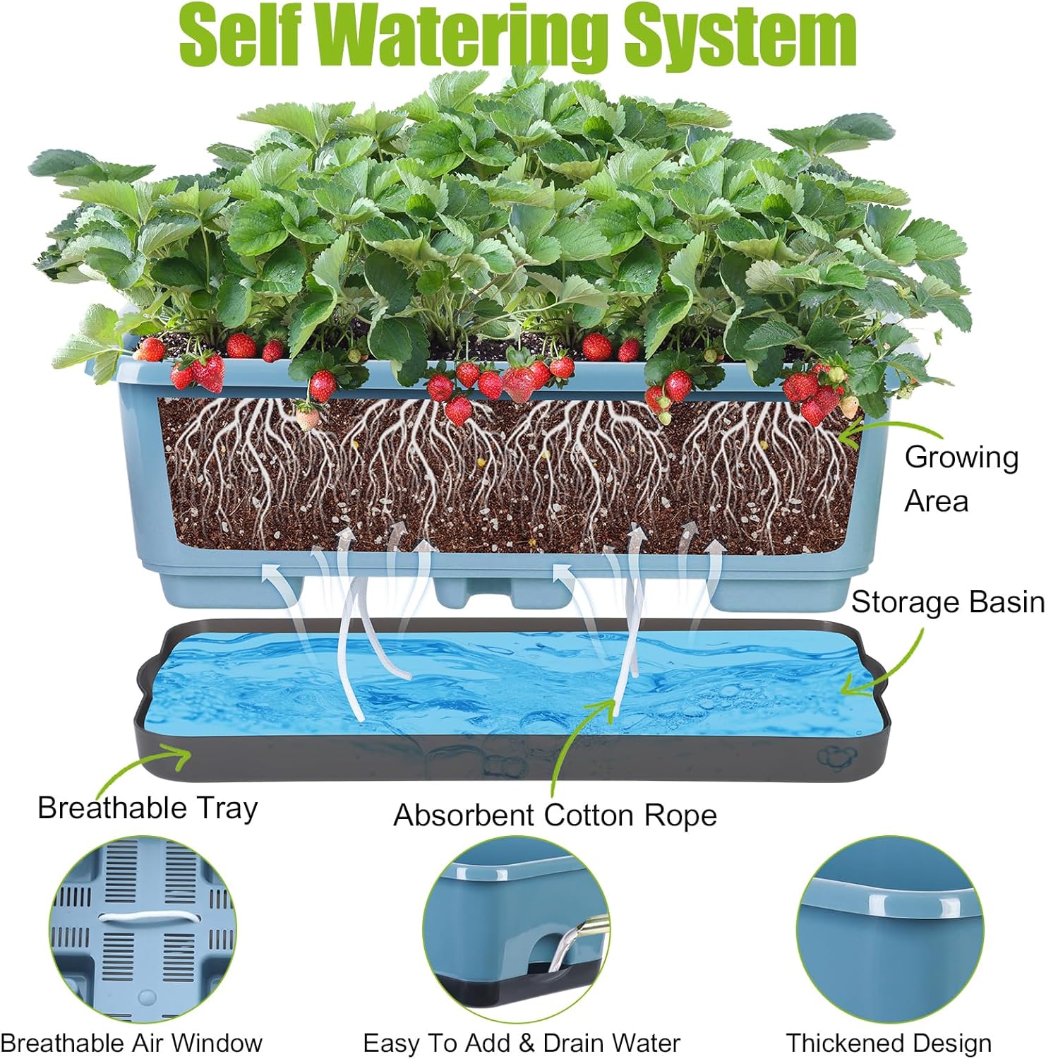 - 【Innovative Self Watering Design】We have absorbent cotton rope for each plant pot, the absorbent cotton rope connects with the water reservoir and plants grow pots, allowing roots and soil to wick water from the reservoir.And keep your plants growing healthily.Our pots are designed with many water drainage holes and air holes on the bottom, which greatly improve air circulation and prevent root rot.