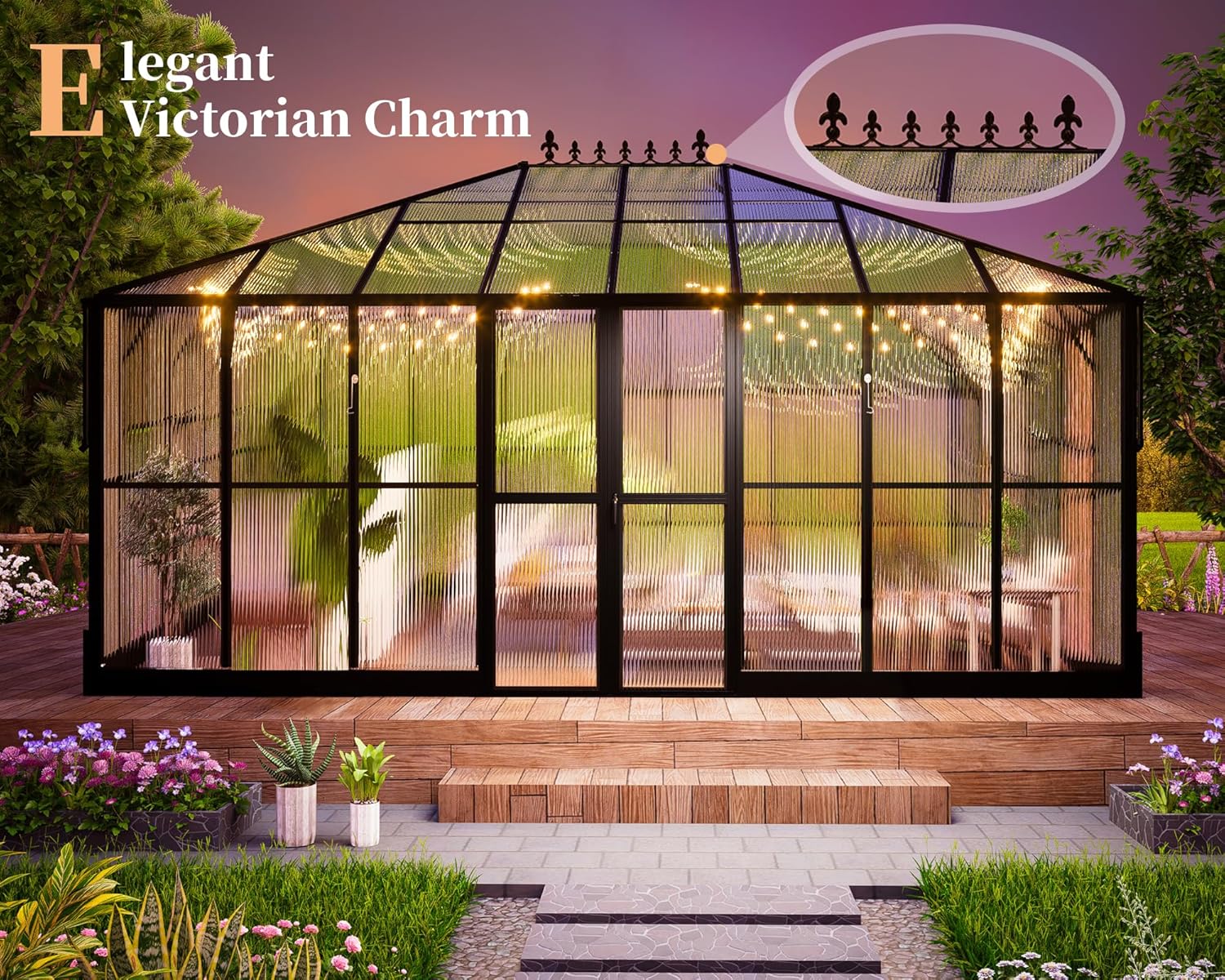 HOWE 16x12x9.5 FT Polycarbonate Greenhouse for Outdoors, Pavilion Style Greenhouse with 4 Vent Windows, Lockable Double Doors, Ideal for Garden & Patio Use, Black