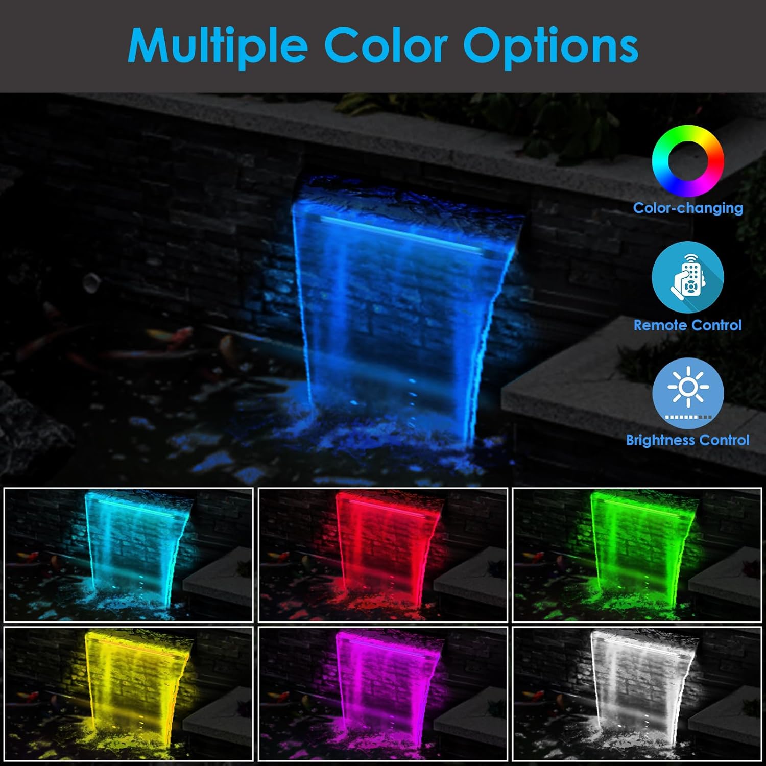 - REMOTE-CONTROLLED LED LIGHTS - This pond waterfall box features remote-controlled colorful LED lights, adding a stunning glow to your waterfall not only in the daytime but also at night! Transform your outdoor space into a magical retreat with ease. REMINDER - Peel off the battery insulation film of the controller, press ON until LED flashes to pair the controller and the light.