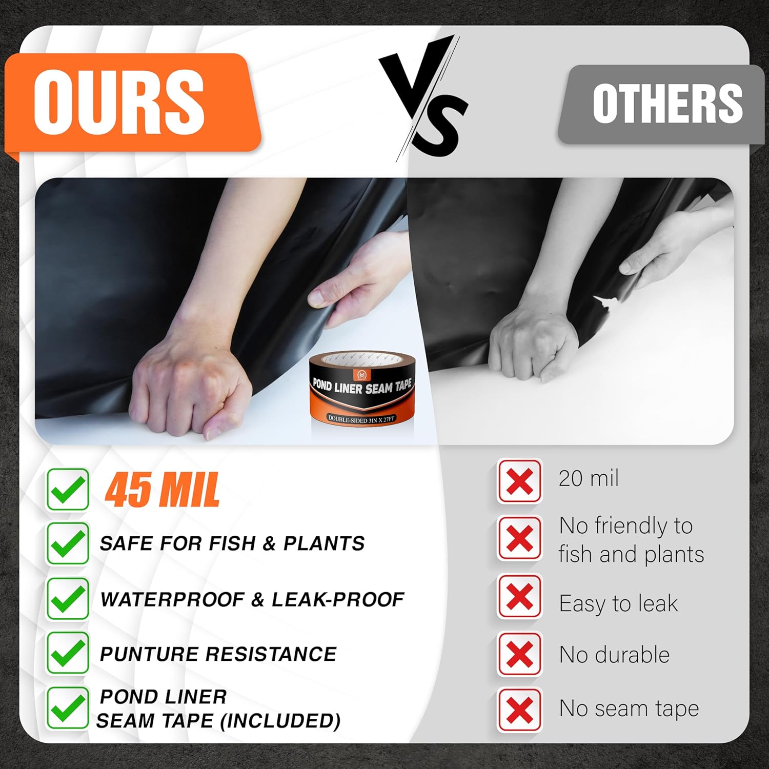 - [Premium Pond Liner Seam Tape Included] When a pond liner accidentally comes into contact with sharp objects, it can leave holes having an impact on the continued use of the liner. So, our self-adhesive design (included) is convenient, you only need to clean up the pond skin to be sealed areas keep the surface dry, then tear the product and apply it to the seam area. It will help to maintain and extend the use of the pond liner.
