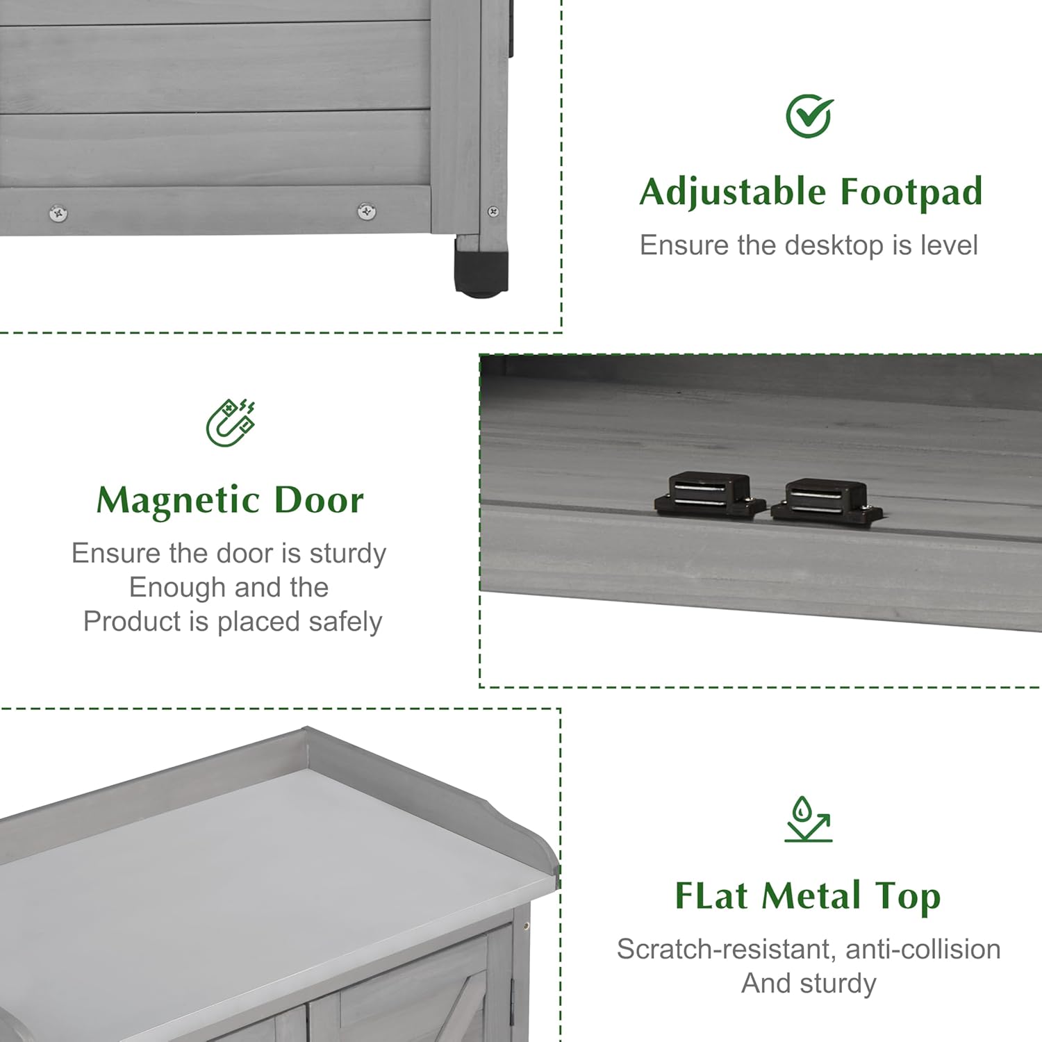 - 【MULTI-USE POTTING BENCH】 It's a multifunctional potting bench with flat metal table top, you can use it for storage cabinet indoor, working bench outdoor, and doing stuffs in garage
