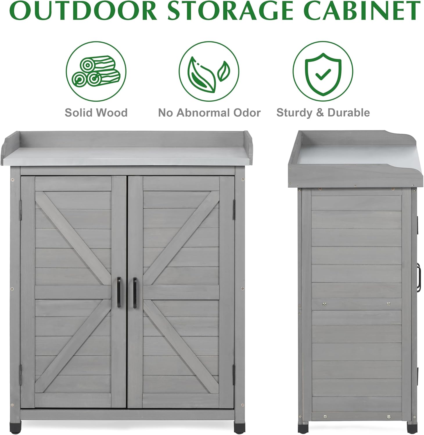 - 【PATENTED FARMHOUSE DESIGN】 Our storage cabinet and potting bench table is made from premium cedar wood with water-based gray coating, designed for classic farmhouse style with US. Patent application