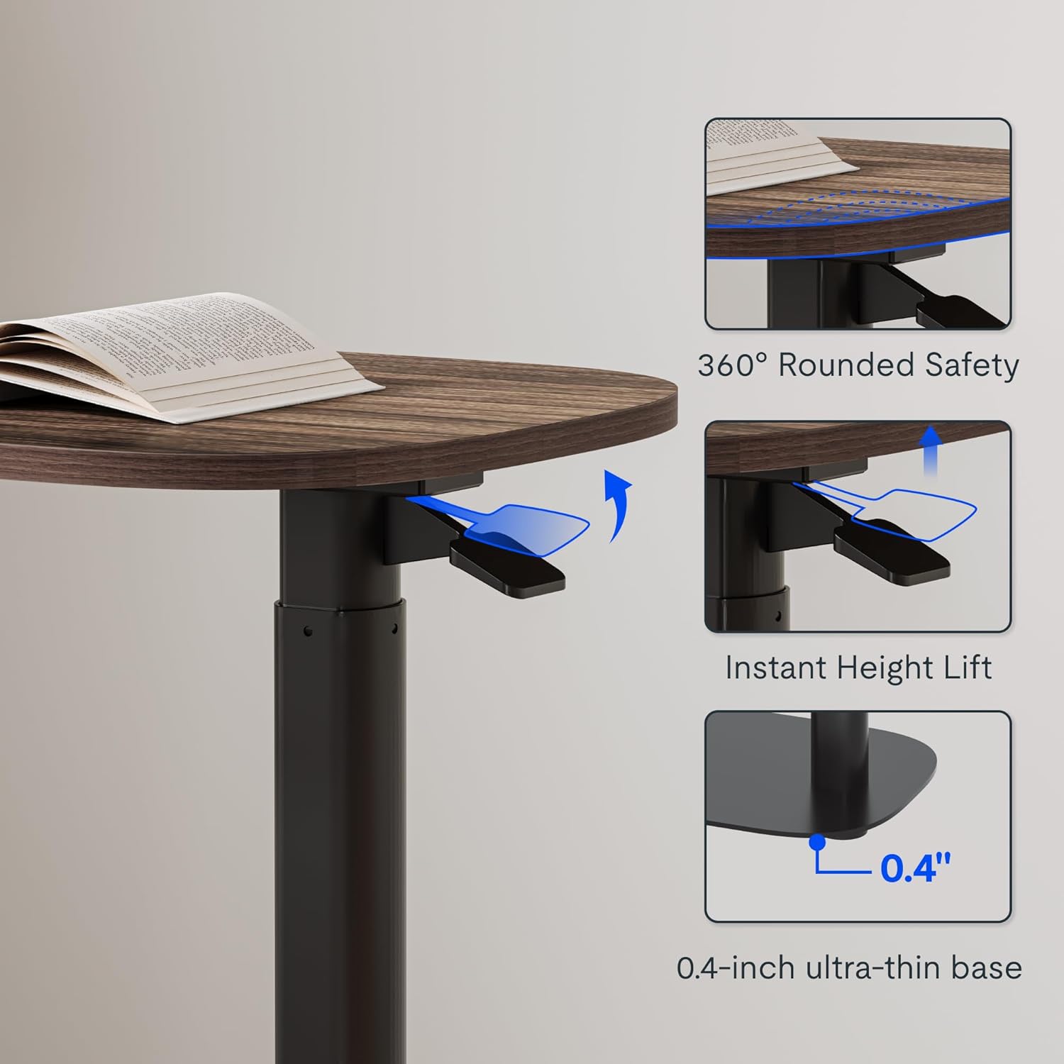 - One-Touch Height Adjustment with Gas Spring Lift (25.4"-41.6"):Effortlessly customize your C-Shaped Table from bedside to standing desk heights using the pneumatic lift system. The gas spring mechanism enables smooth one-handed operation – perfect as an overbed table for patients, an adjustable laptop desk, or a sofa-side snack table – all without bending or straining.