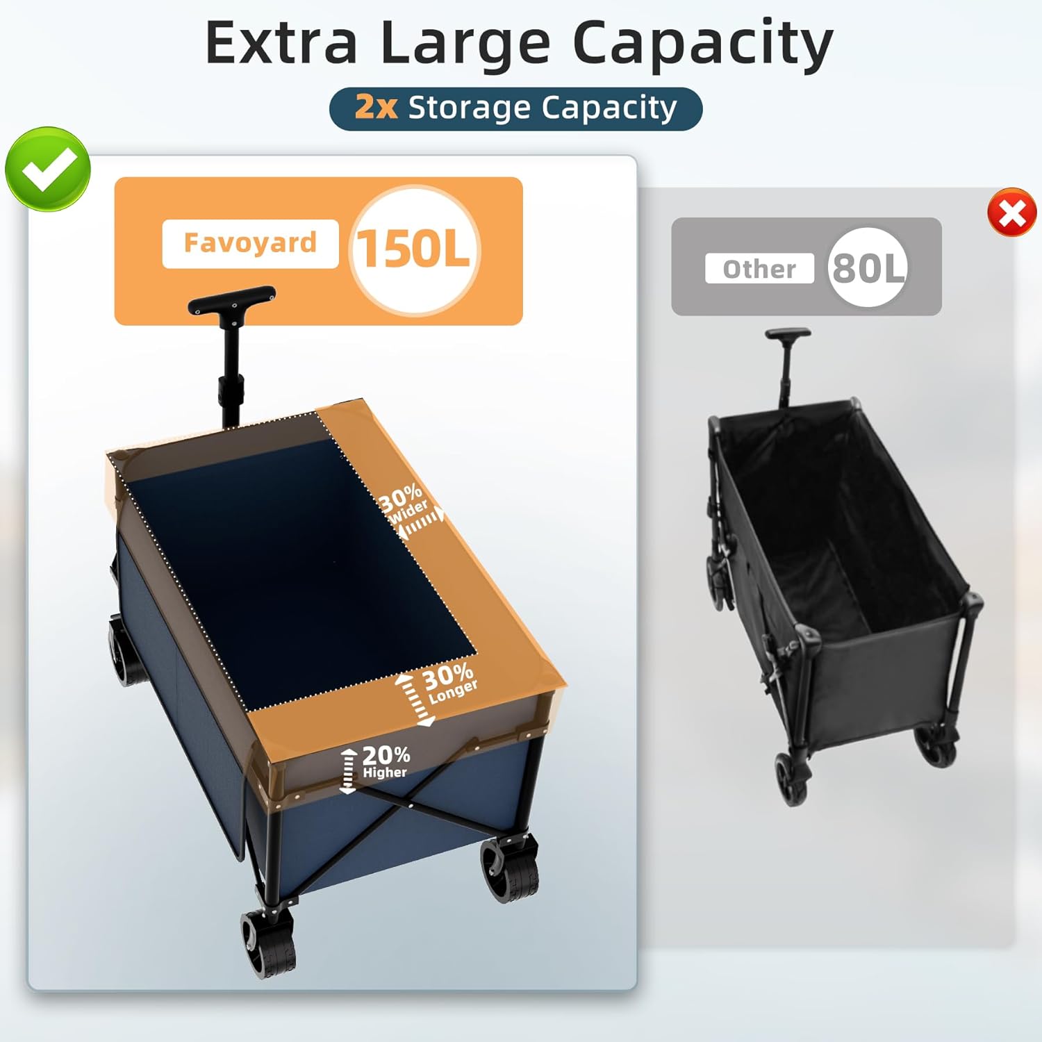 - 150L Storage Capacity, 2x Others - Compared with other standard-sized wagons, this Favoyard collapsible wagon has deeper and larger storage space, offering 150L storage capacity to hold all your stuff. What's more, 2 side storage pockets add extra convenience for your small items. Allows you to transport sizable loads, reducing the need for multiple trips.