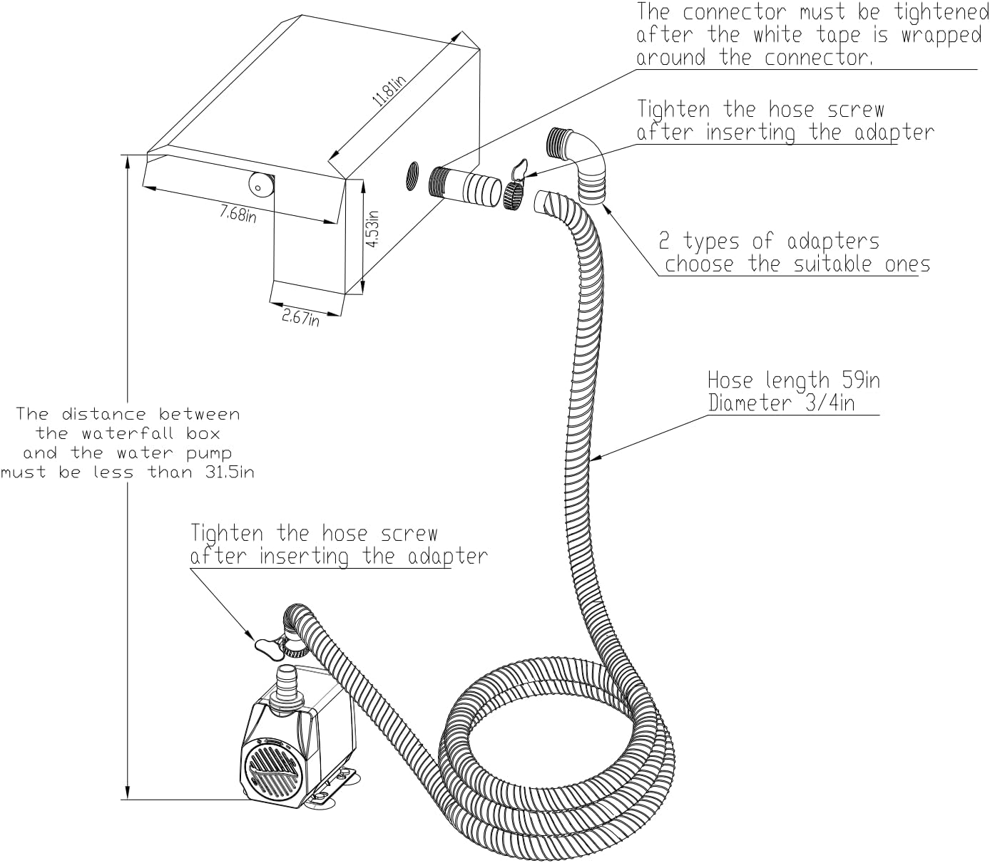 - Special Feature : 59in threaded tube, 660GPH pump, Lighted, Pipe bending adapters and straight-through adapters, Waterfall box 59in threaded tube, 660GPH pump, Lighted, Pipe bending adapters and straight-through adapters, Waterfall box