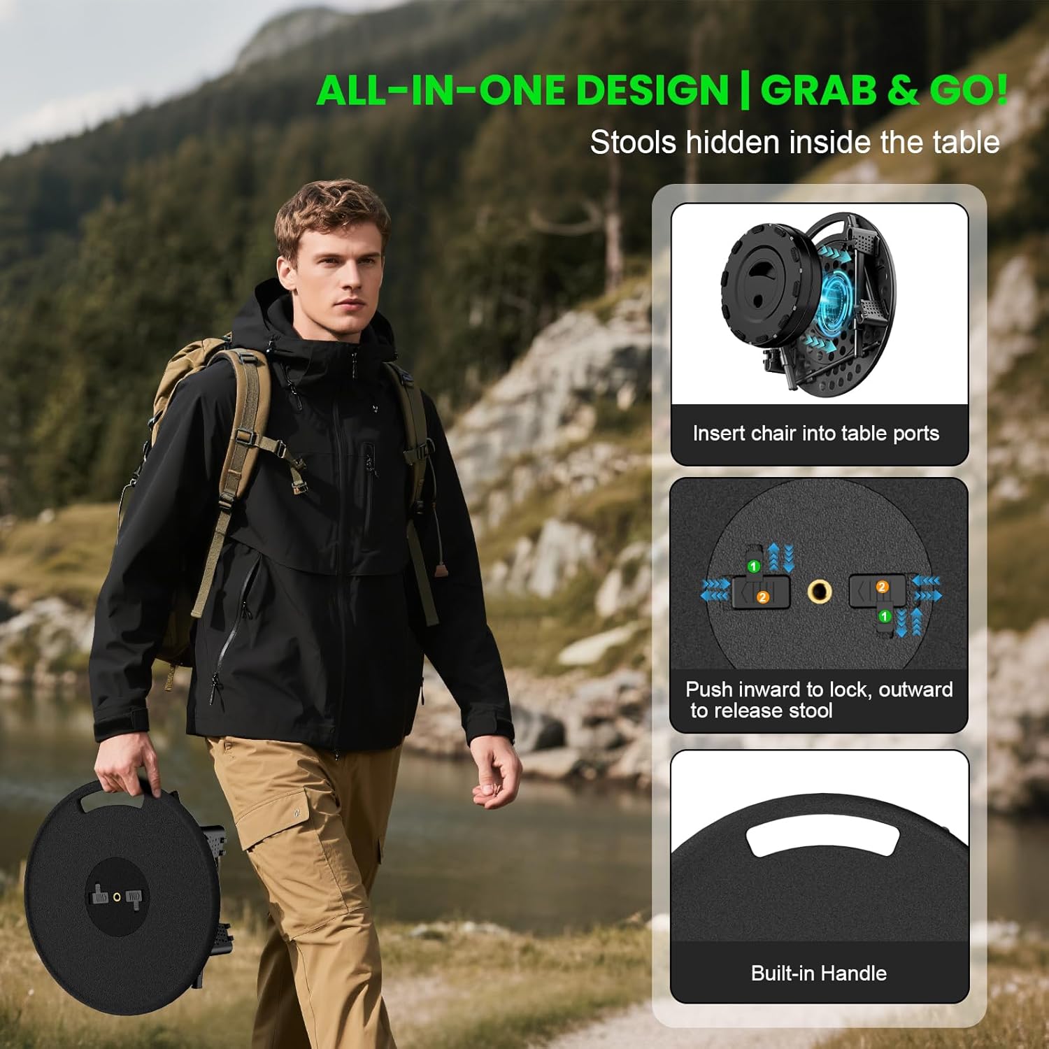 - 【Ultra-Portable & Compact】 The all-in-one set includes a foldable table and a retractable stools that store completely inside the table for ultra-compact transportation.