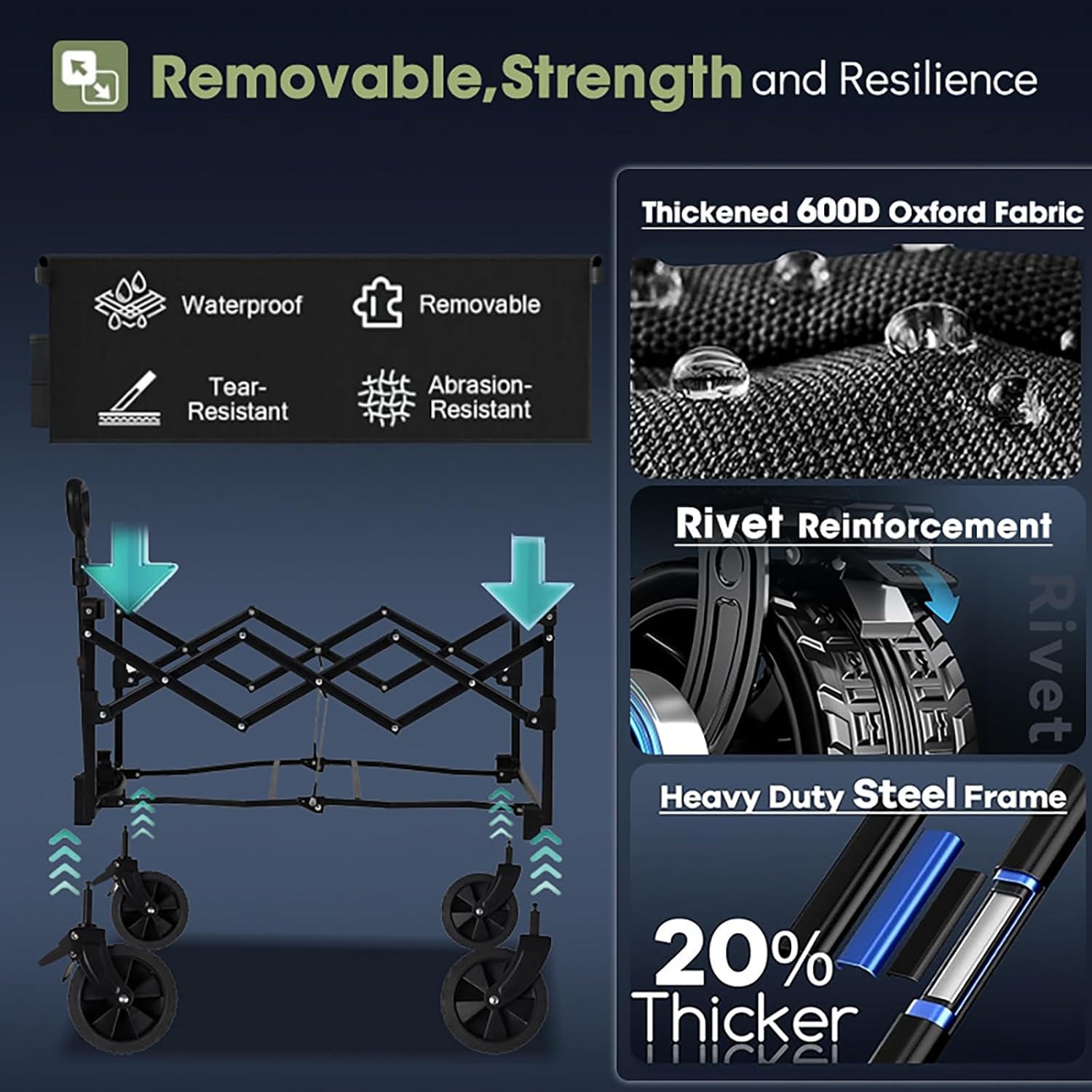 - 【Sturdy & Waterproof Premium Materials】: Made of high-quality 600D premium Oxford fabric, it can hold 560LBS load capacity. The wagon cart is sturdy, long-lasting and water, scratch, tear and wear resistant. Easily handle severe weather and heavy loads conditions. Enjoying outdoor activities with peace of mind