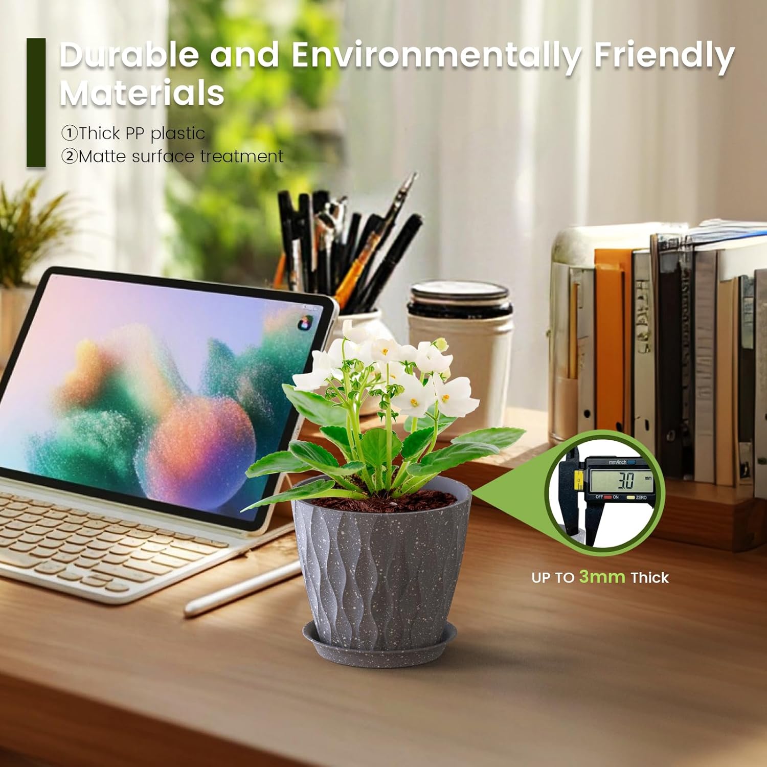 5 inch Plant Pots for Indoor Outdoor Plants, 6 Pack Thick Flower Pots with Drainage Holes and Saucers, 3D Modern Wave Texture Small Plastic Planters Nursery Pots, Speckled Grey