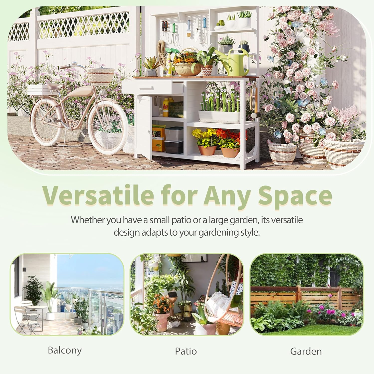 - Spacious and organized: 50.2-inch work surface 🌿 Enjoy ample space for potting and planting with a spacious work surface, plus a convenient upper storage cabinet. Keep your tools organized with hooks, shelves, drawers, and adjustable cabinets—all within easy reach!