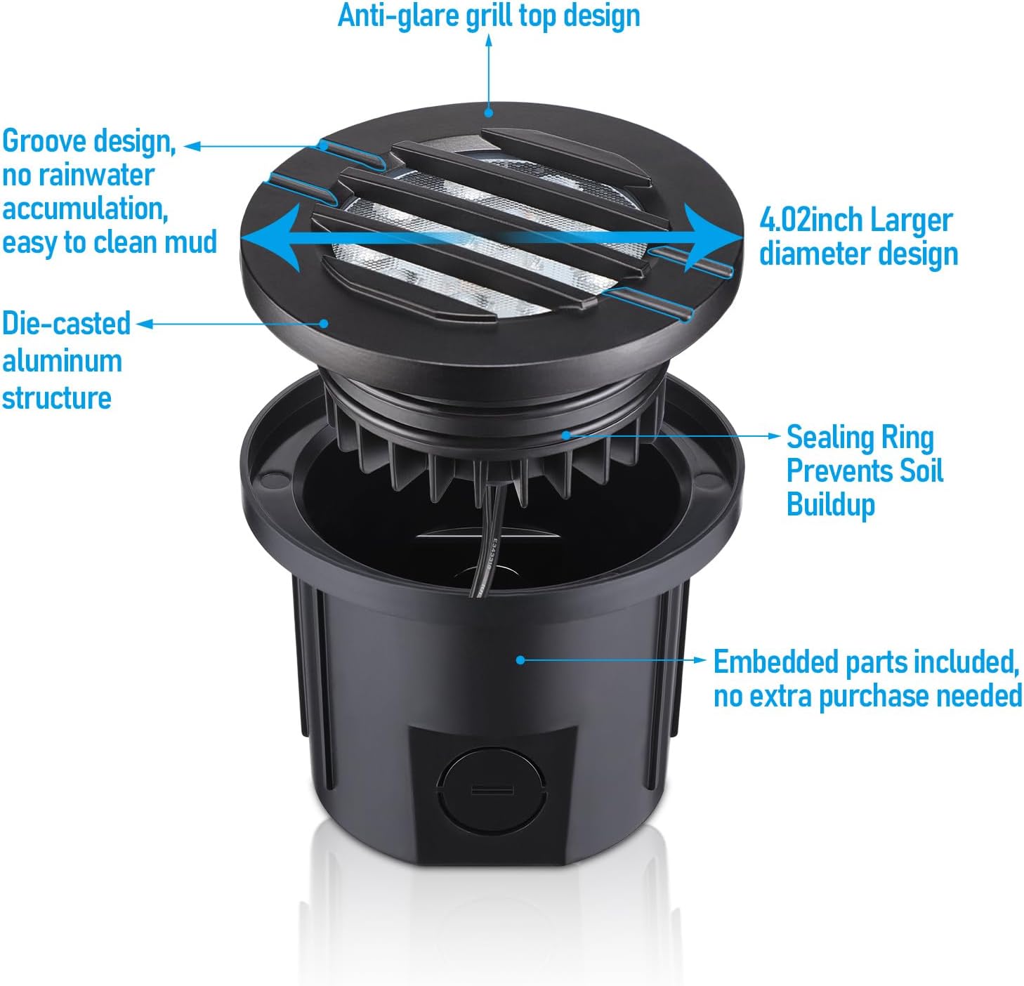 - Flat Vertical Grille Design: The unique flat vertical grille improves drainage, reduces debris buildup, and softens harsh light to minimize glare. Each product includes an embedded part to enhance waterproofing and simplify installation