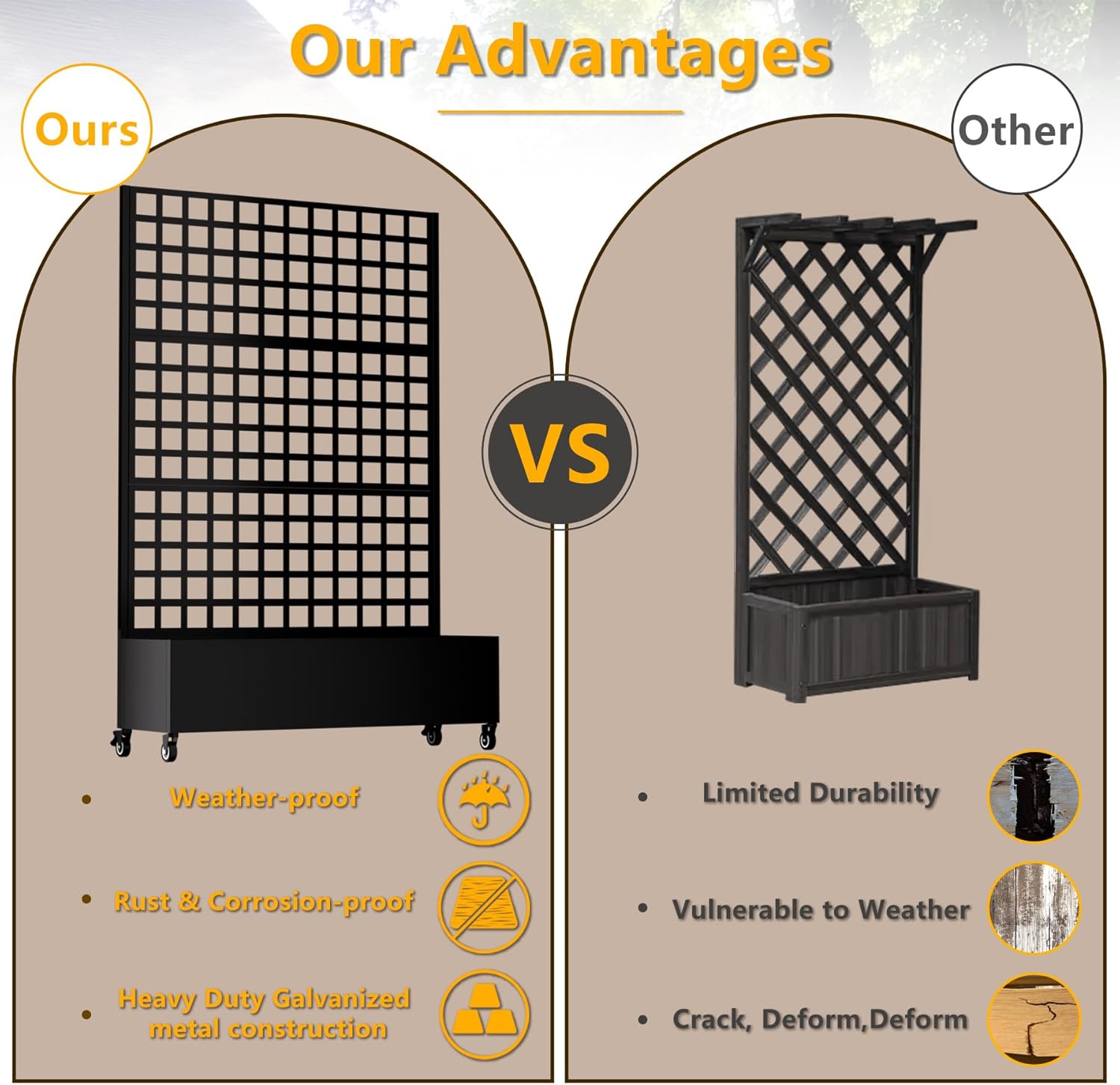 - 【Weather-Resistant Premium Galvanized Durability】Crafted from premium galvanized steel with reinforced multi-layer coating, this metal planter box with trellis offers excellent rust and corrosion resistance. The weighted base provides stability against strong winds, ensuring long-lasting outdoor performance.