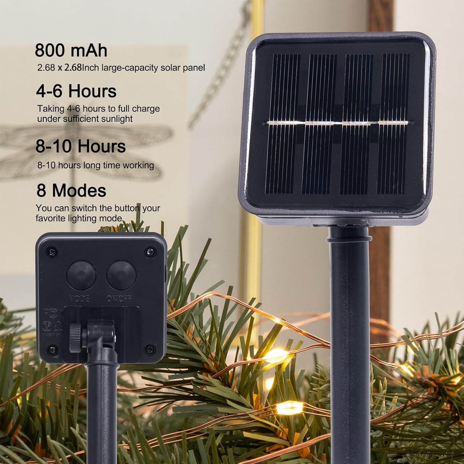 - Effortless Solar Power & All-Night Brilliance:The solar string lights for outside feature a 800mAh battery and premium solar panel, delivering 8-10 hours auto-illumination. Adopting high-efficiency solar panels,it automatically absorbs sunlight and converts it into electricity during the day, no external power supply is needed, energy saving and emission reduction
