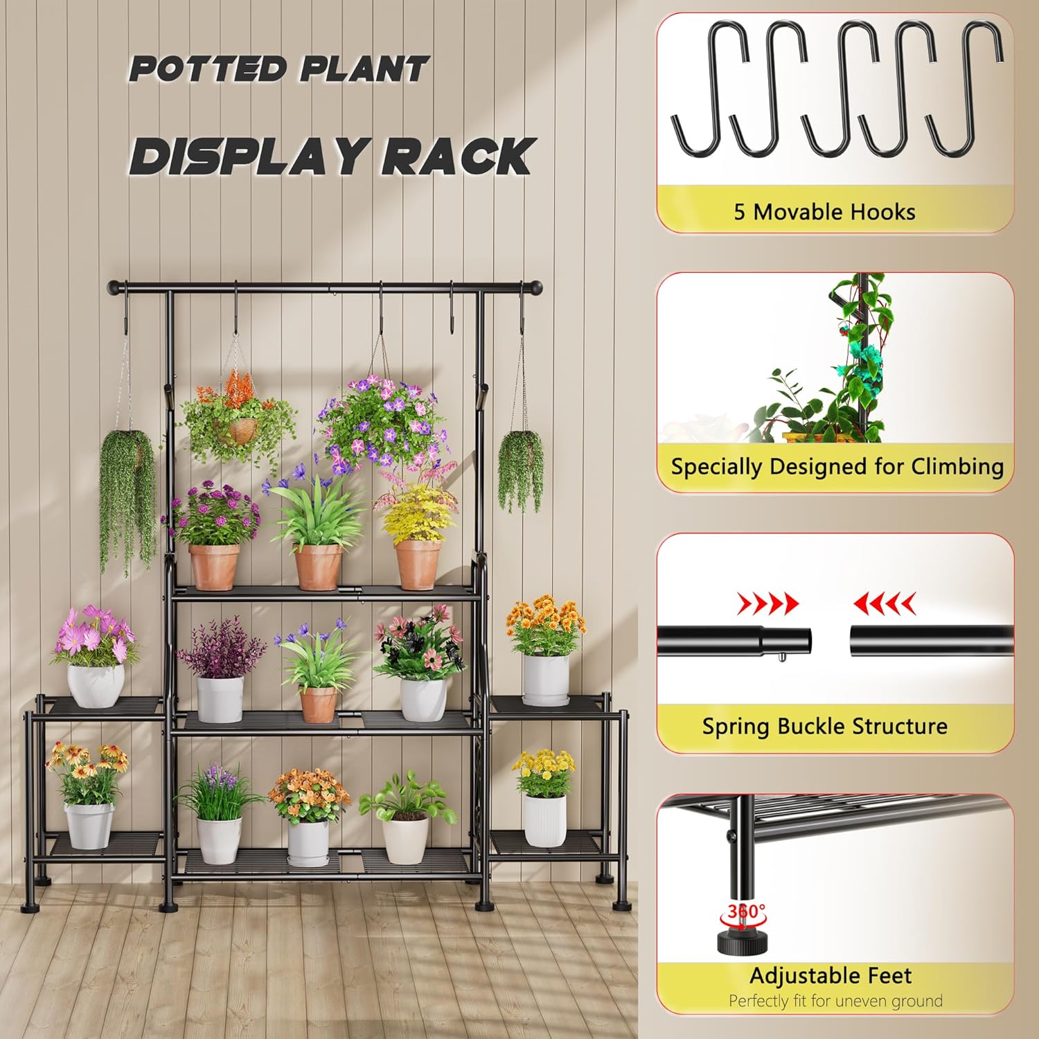 - 【🚀 Upgrade 7-Tier Large Capacity Design】Accommodates 16-25 plants simultaneously with 5 moveable hanging hooks – ideal for displaying trailing plants like pothos or petunias. Perfect for space-saving in apartments, patios, or garden corners