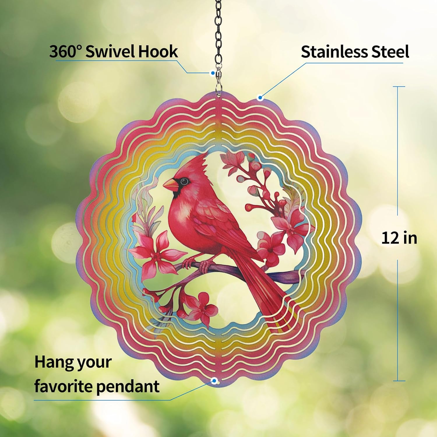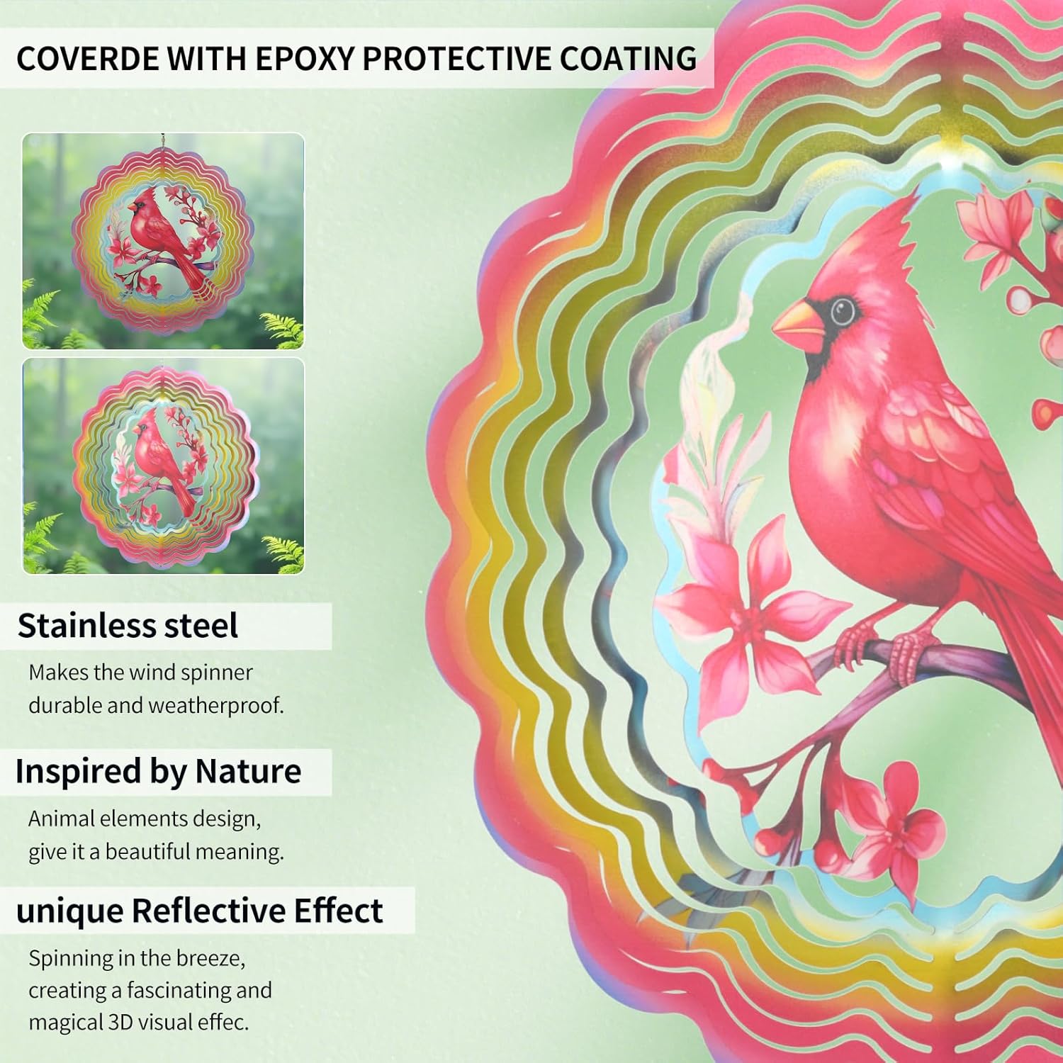 - 12inch 3D Cardinala Wind Spinner Decor - Eandisom Cardinala Metal Wind Spinner is made from Sturdy stainless steel material by laser-cutting technology to form vivid shape, makes it flexible and strong, is individually hand painted by epoxy protective coating with colorful sparkle powder inside to highly resist weather and rust. a frosted paint finish, giving off a sparkling when it spin. The unique design combined meaningful animal pattern and a 3D streamer effect.