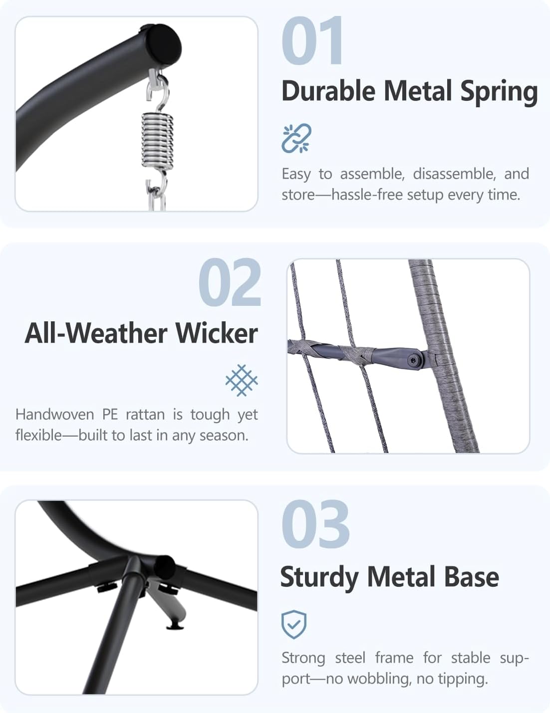 - Easy, Tool-Free Assembly: Set up your wicker egg chair in under 30 minutes—no tools, no stress. Clear instructions make solo installation a breeze. Compared to most patio egg chairs, you'll enjoy quicker setup and faster relaxation