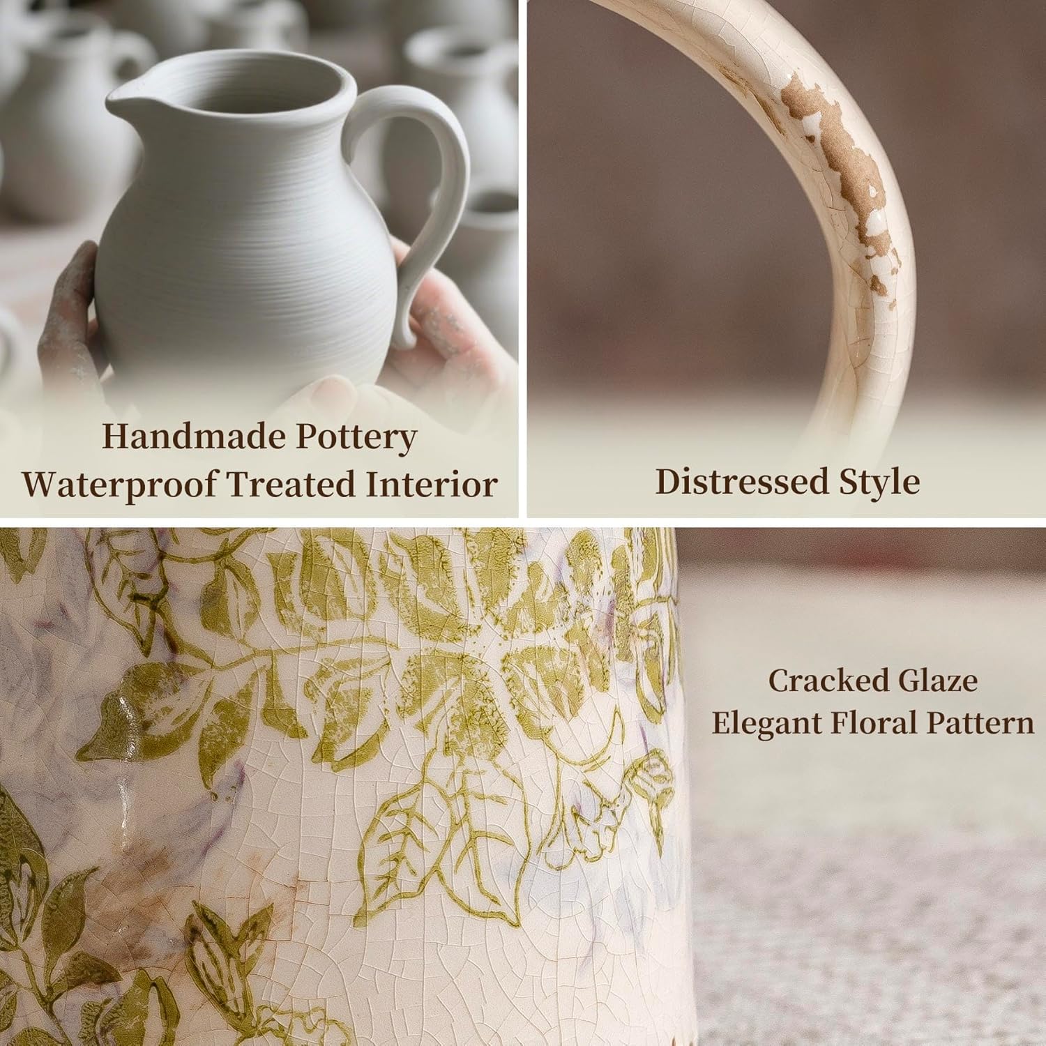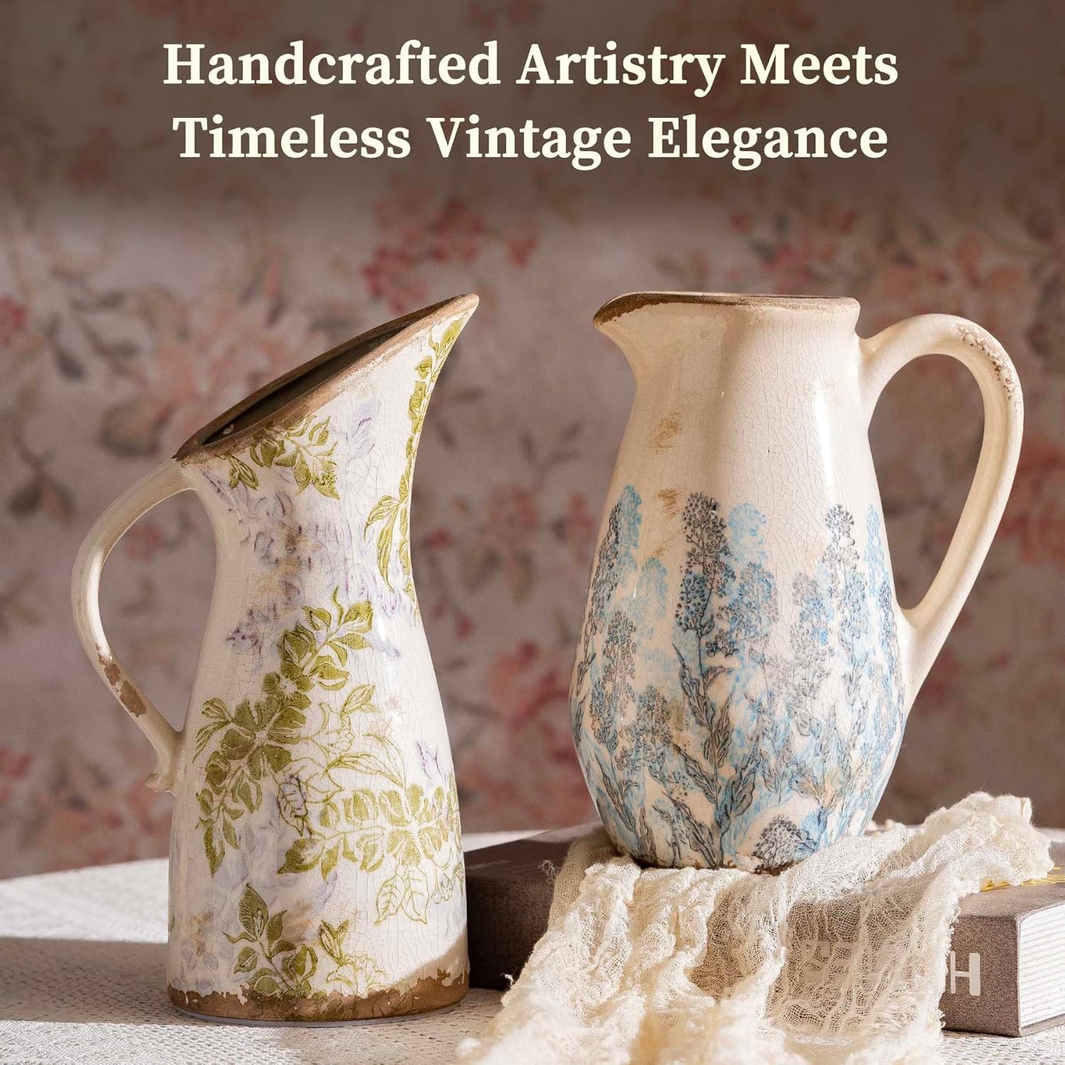 - Handmade Vintage Floral Pitcher Vase: This exquisite ceramic vase showcases intricate handmade green and purple floral patterns on a warm beige background, capturing authentic vintage home decor charm. Inspired by Chinoiserie and farmhouse aesthetics, its classic pitcher shape with handle embodies timeless Tuscan decor and grand millenial style.