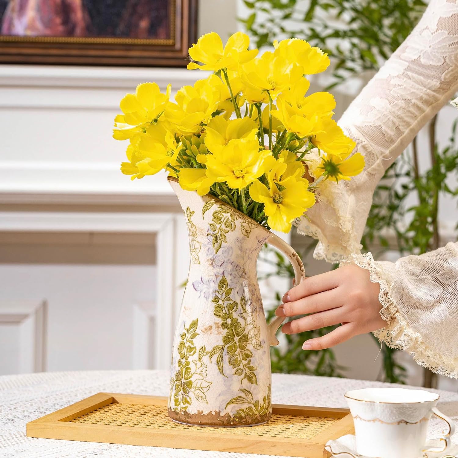 Vintage Ceramic Pitcher Vase with Handle, Farmhouse Green and Purple Large Floral Vases, French Country Decorative Vase, Rustic Table Centerpiece for Home Decor, Bookshelf, Office 10.5 Inch