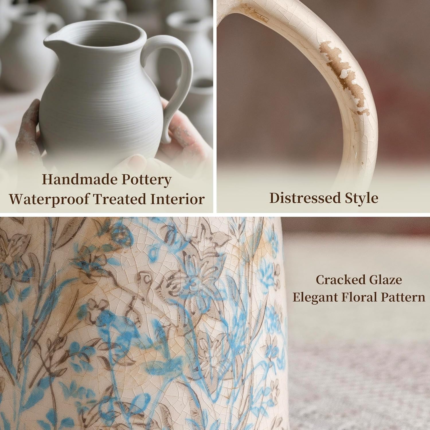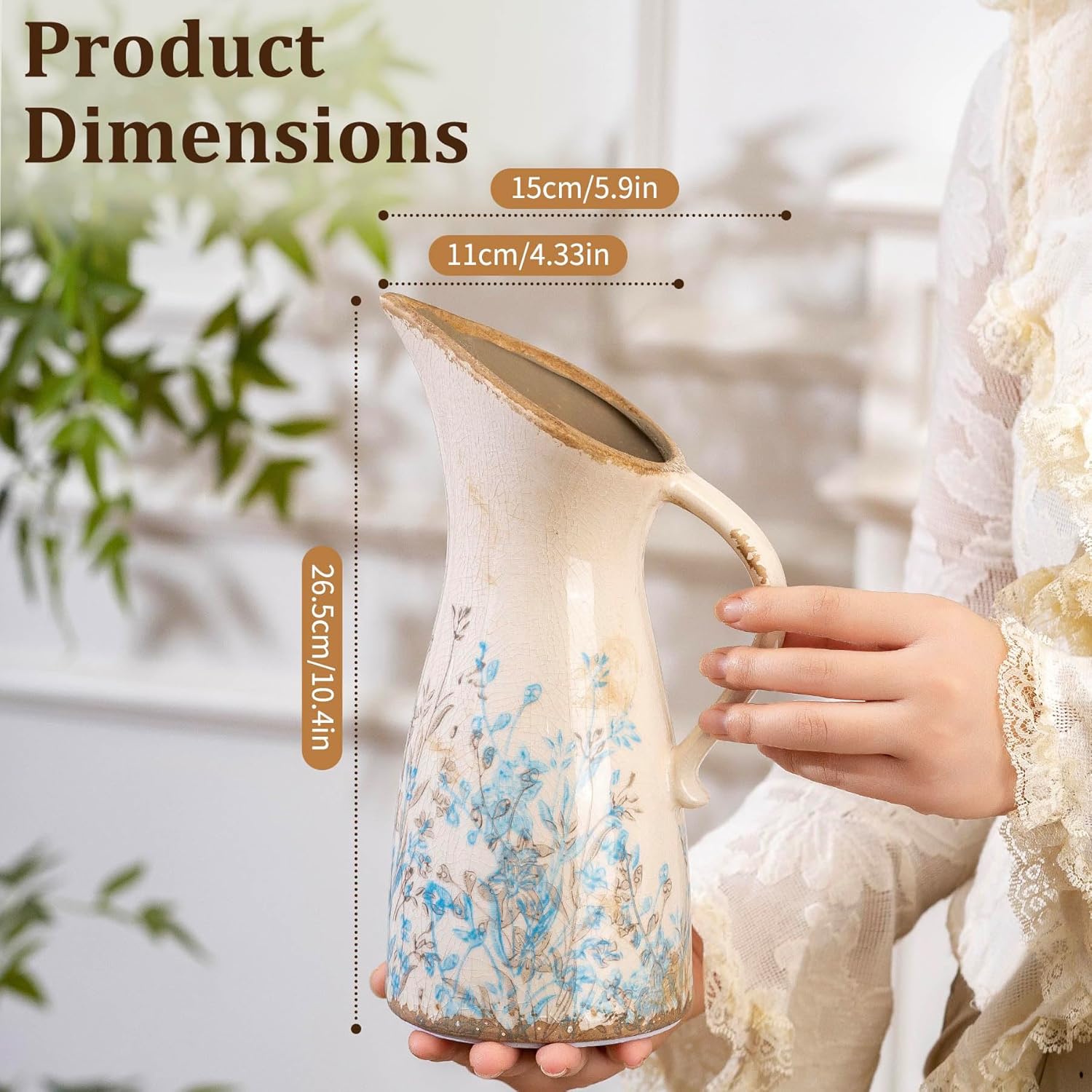Vintage Ceramic Pitcher Vase with Handle, Farmhouse Blue and Brown Large Floral Vases, French Country Decorative Vase, Rustic Table Centerpiece for Home Decor Living Room, Bookshelf, Office 10.5 Inch