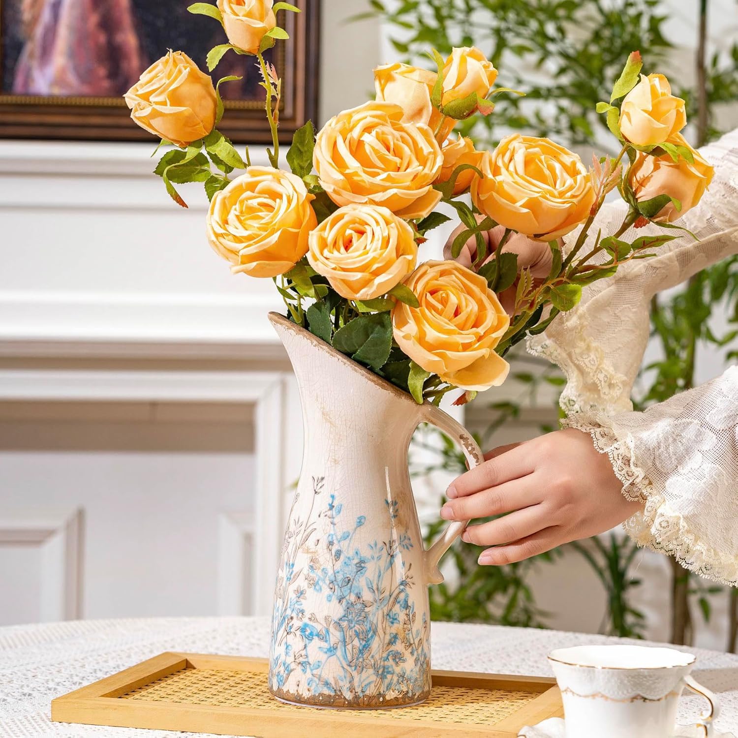 - Handmade Vintage Floral Pitcher Vase: This exquisite ceramic vase showcases intricate handmade green and purple floral patterns on a warm beige background, capturing authentic vintage home decor charm. Inspired by Chinoiserie and farmhouse aesthetics, its classic pitcher shape with handle embodies timeless Tuscan decor and grand millenial style.