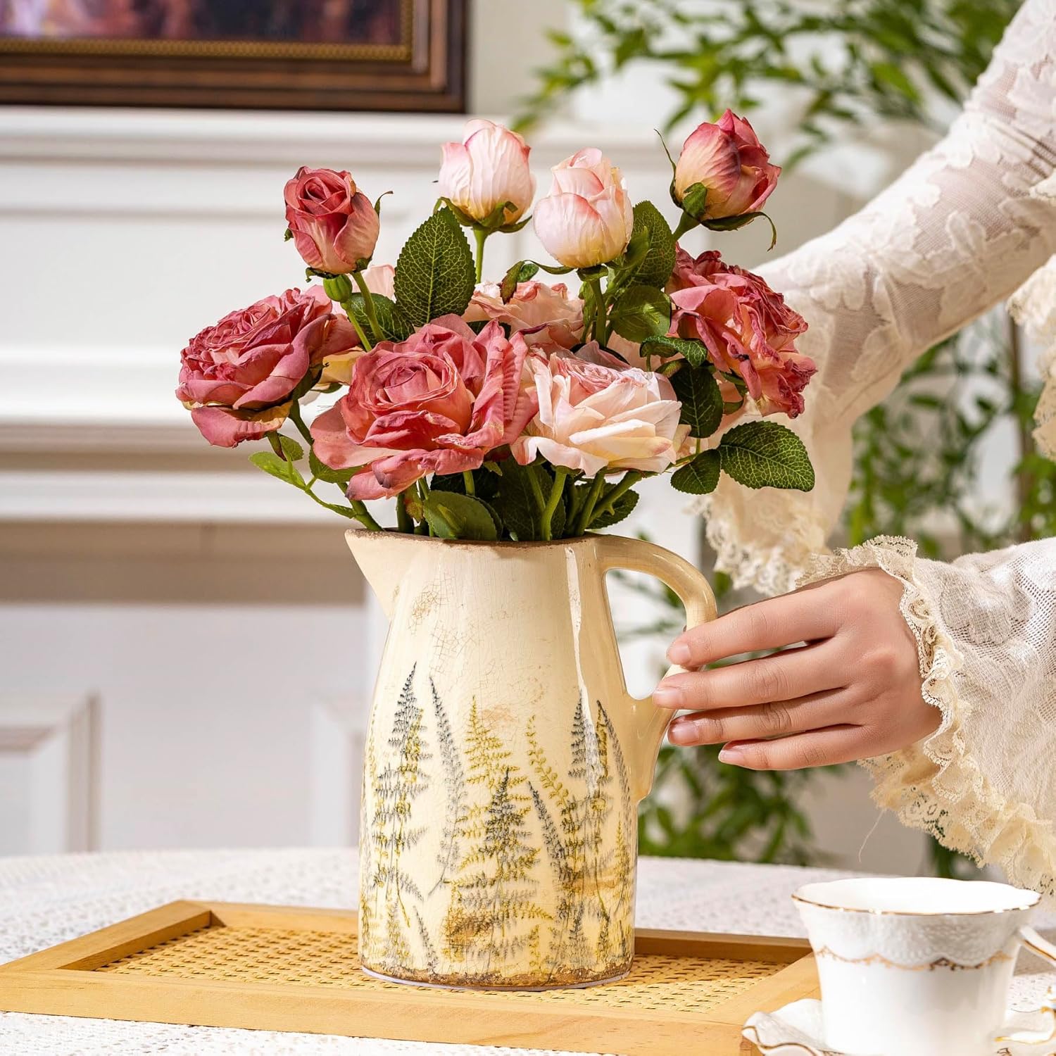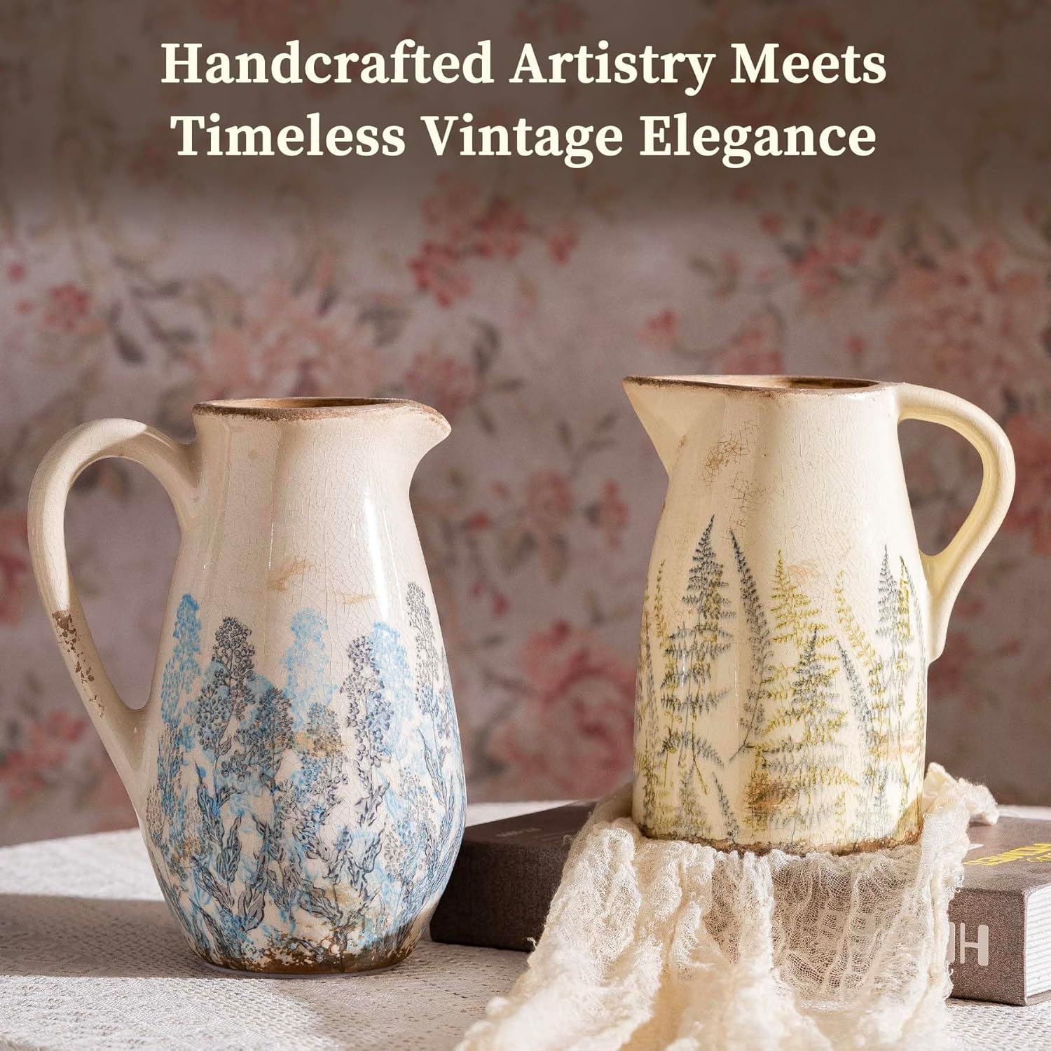 Vintage Ceramic Pitcher Vase with Handle, Farmhouse Green and Purple Large Floral Vases, French Country Decorative Vase, Rustic Table Centerpiece for Home Decor, Bookshelf, Office 7.3 Inch