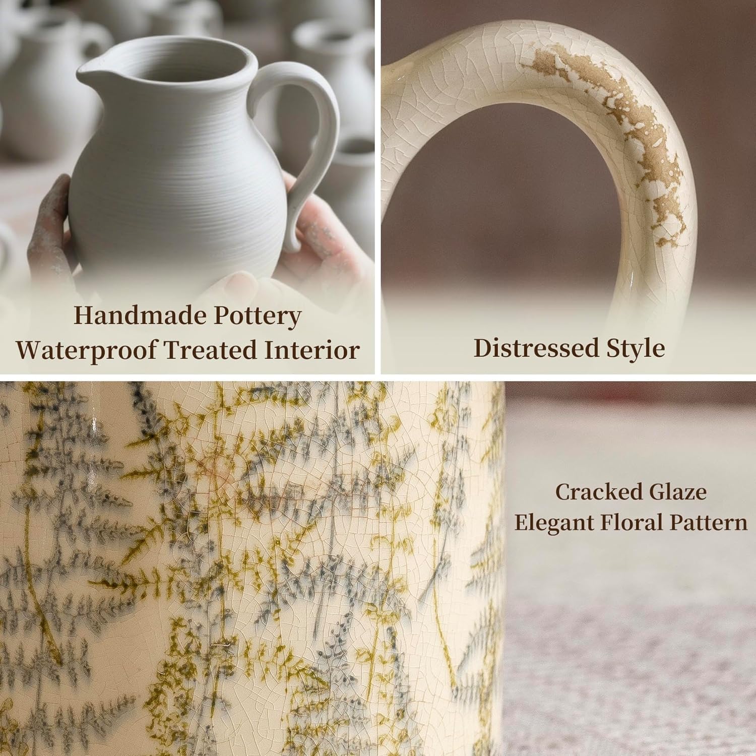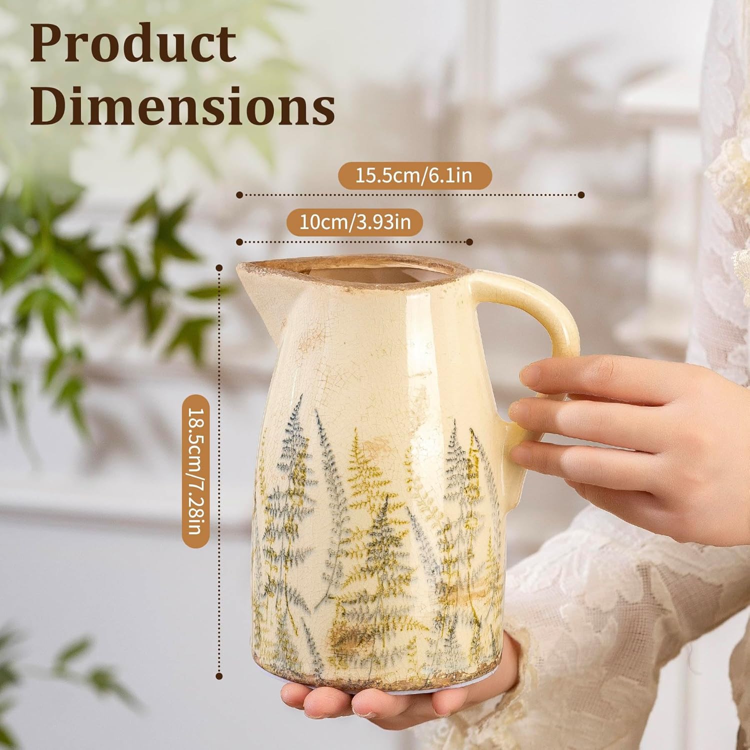 - Timeless Chinoiserie Floral Design: Handcrafted ceramic pitcher vase showcases intricate light and deep green floral motifs against a warm beige backdrop, embodying Tuscan-inspired farmhouse elegance with its curved handle silhouette for grand millennial interiors.
