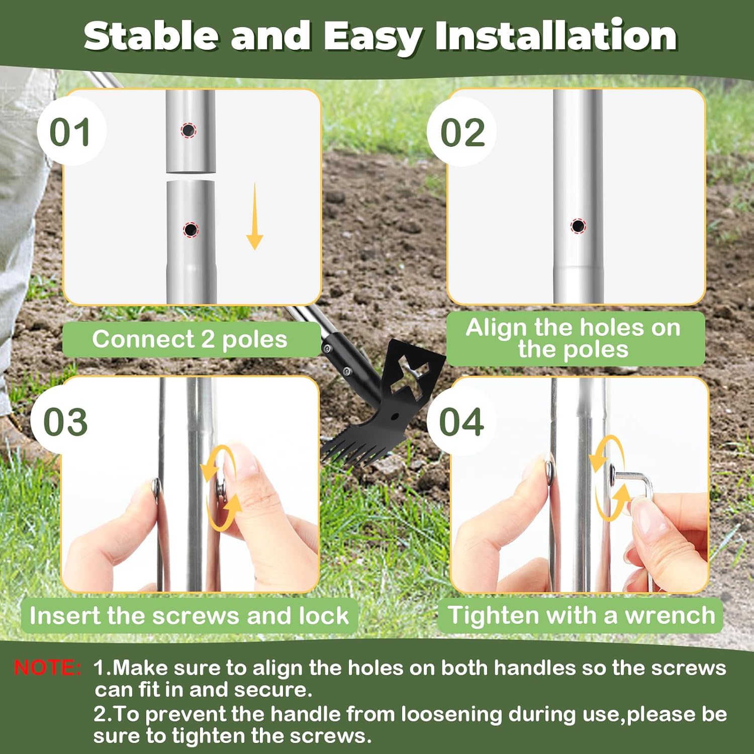 - [Customer Service]: NICOFPHY hand weeding tool with long handle includes 2 in 1 weed rake head, 4 stainless steel poles and 3pcs threaded screws. Easy to install, use, clean and maintain. This weeder tool is Patented Product, if you have any other questions about the product or if there are any parts missing after receiving the package, please contact us and we will give you a satisfactory solution within 12 hours