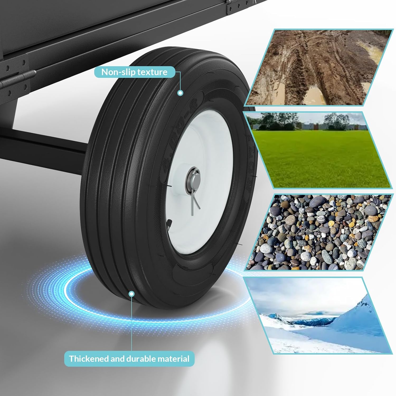 - 【All-Terrain Pneumatic Tires for Smooth Transport】 Equipped with heavy-duty pneumatic tires, this yard cart offers excellent shock absorption and maneuverability over gravel, dirt, grass, and rugged terrain. Perfect for farm trailers or lawn mower carts.