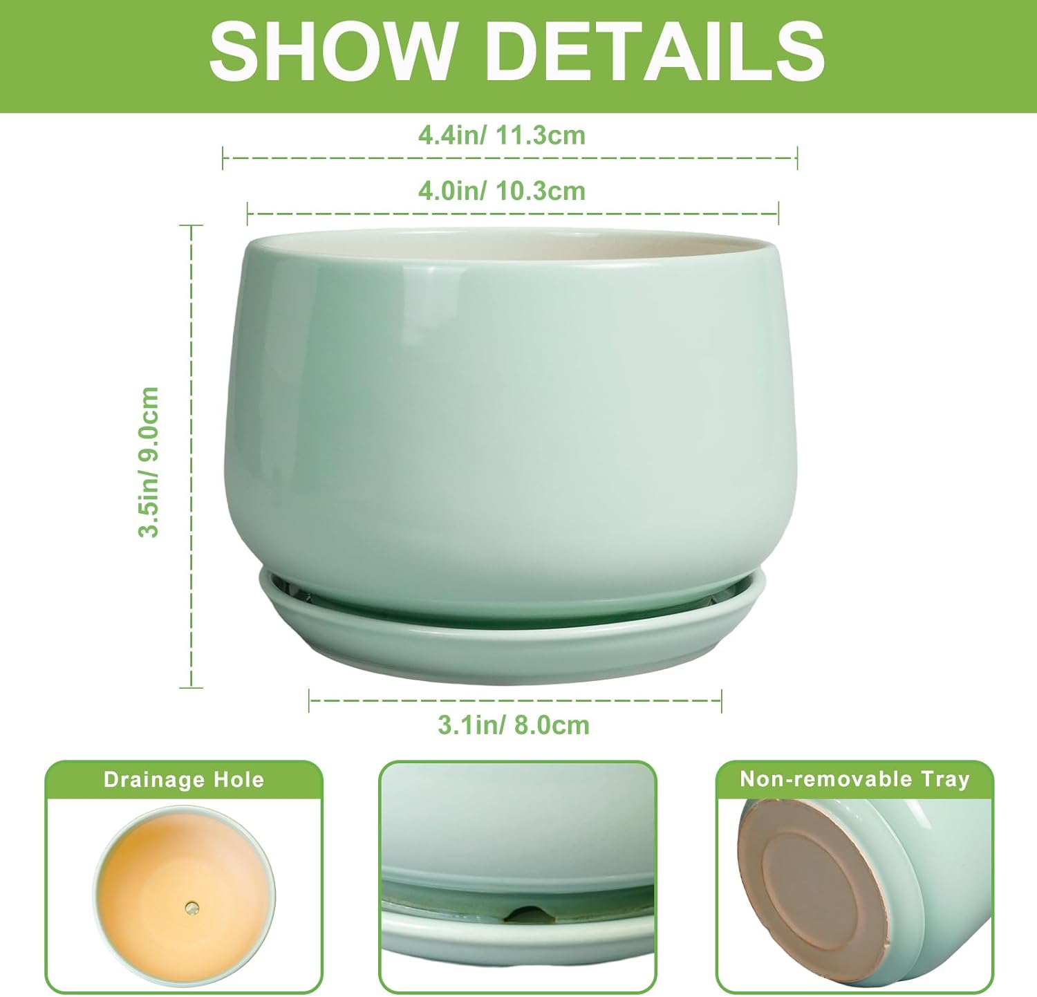 - Dimensions: The waist diameter of these ceramic plant pots is 4.4"/ 11.3cm, the external caliber is 4.0"/ 10.3cm, the height is 3.5"/ 9.0cm. This green plant pot is an ideal choice for growing succulent plants, cacti, aloe vera, orchids, snake plant, african violet, mint, rosemary, herbs, and other indoor & outdoor plants