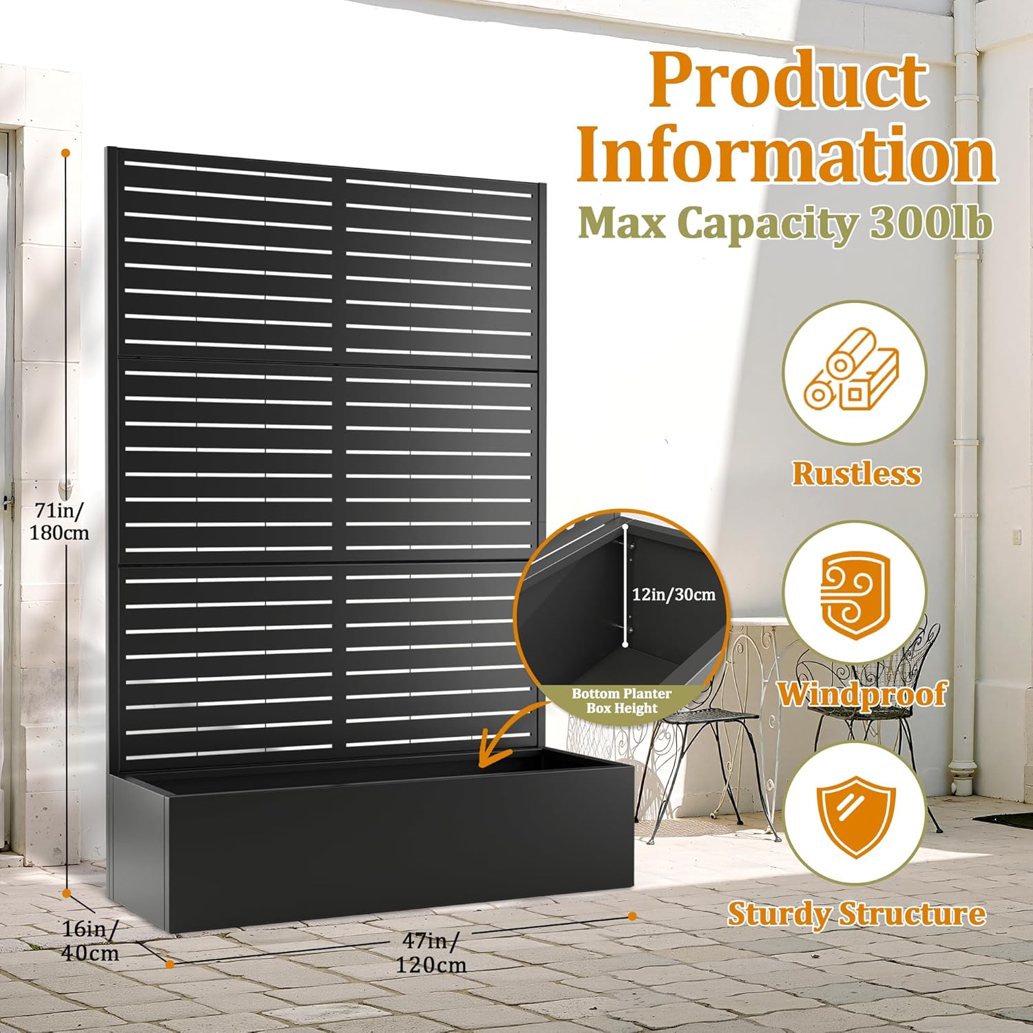 - 🛡️【Outdoor Privacy Screen & Metal Planter Box with Trellis】Use this metal planter box with trellis to create a natural divider on your patio, balcony, or yard. It’s more than just a garden raised bed for climbing plants—it’s also a beautiful metal planter with privacy screen that offers shade and separation. The sleek black frame and vertical lines of this metal planter box with trellis make it both decorative and practical.