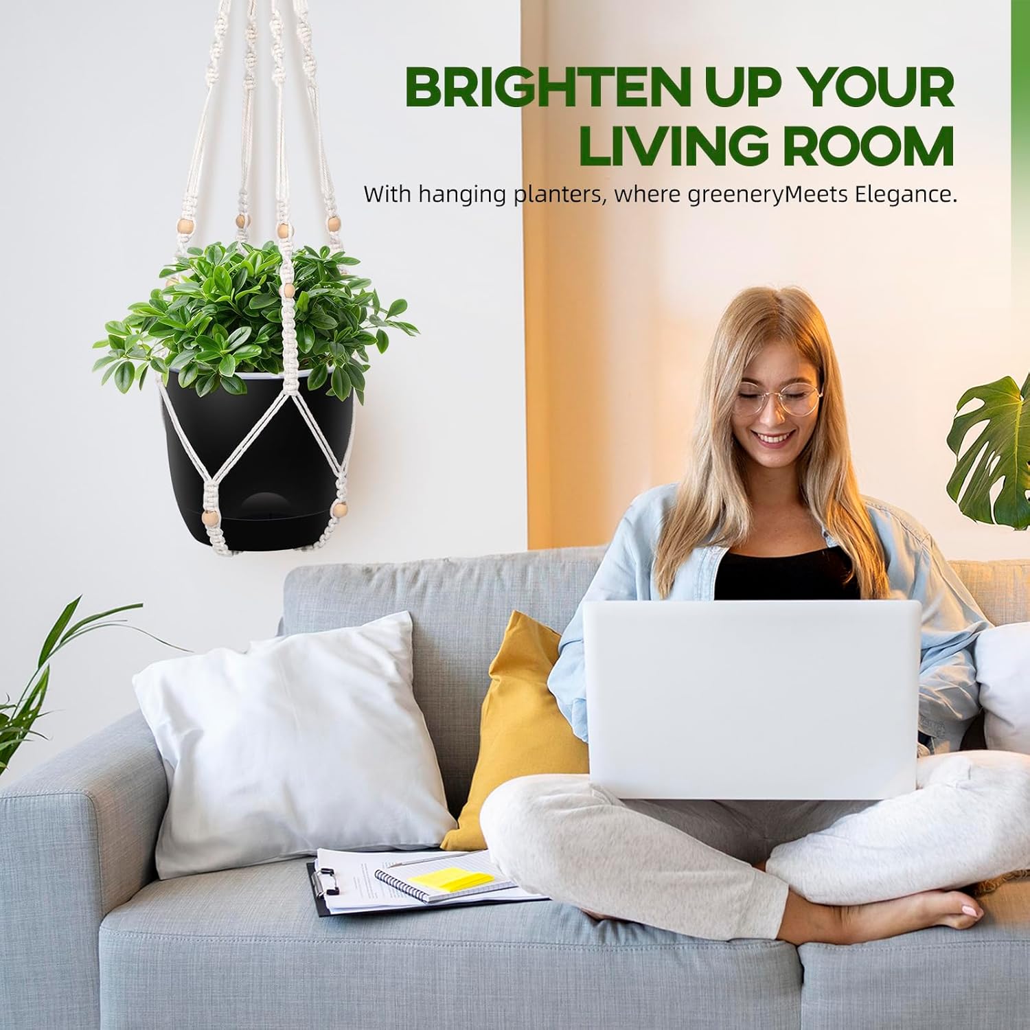 2-Pack 5.7-Inch Self-Watering Hanging Planters for Indoor & Outdoor Plants,34Inch Macrame Hanger Plant Pots Indoor with Drainage,Small Hanging Planters & Baskets,With Two Sets of Hooks(Pure black)