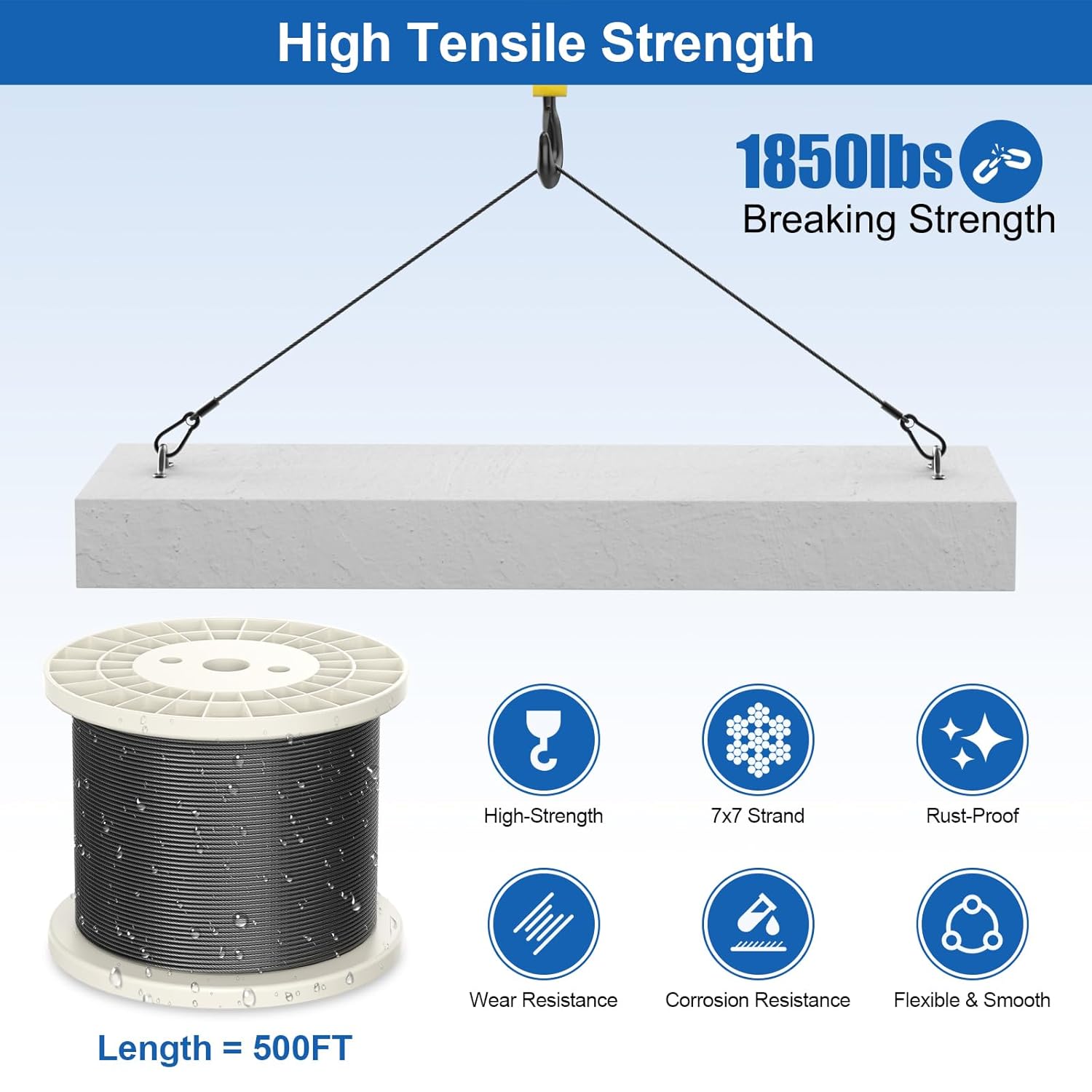 - 【Size】1/8" stainless steel cable diameter (3.2MM), with a breaking strength of 1850 lbs. Featuring a 7x7 strand construction (7 strands of 7 wires each), this black stainless steel wire rope offers superior strength combined with semi-flexibility. The included cable cutter allows you to easily customize the length to your exact requirements, ensuring smooth cuts and clean, burr-free ends. Engineered for both robustness and necessary flexibility, it's an excellent choice for railing installations