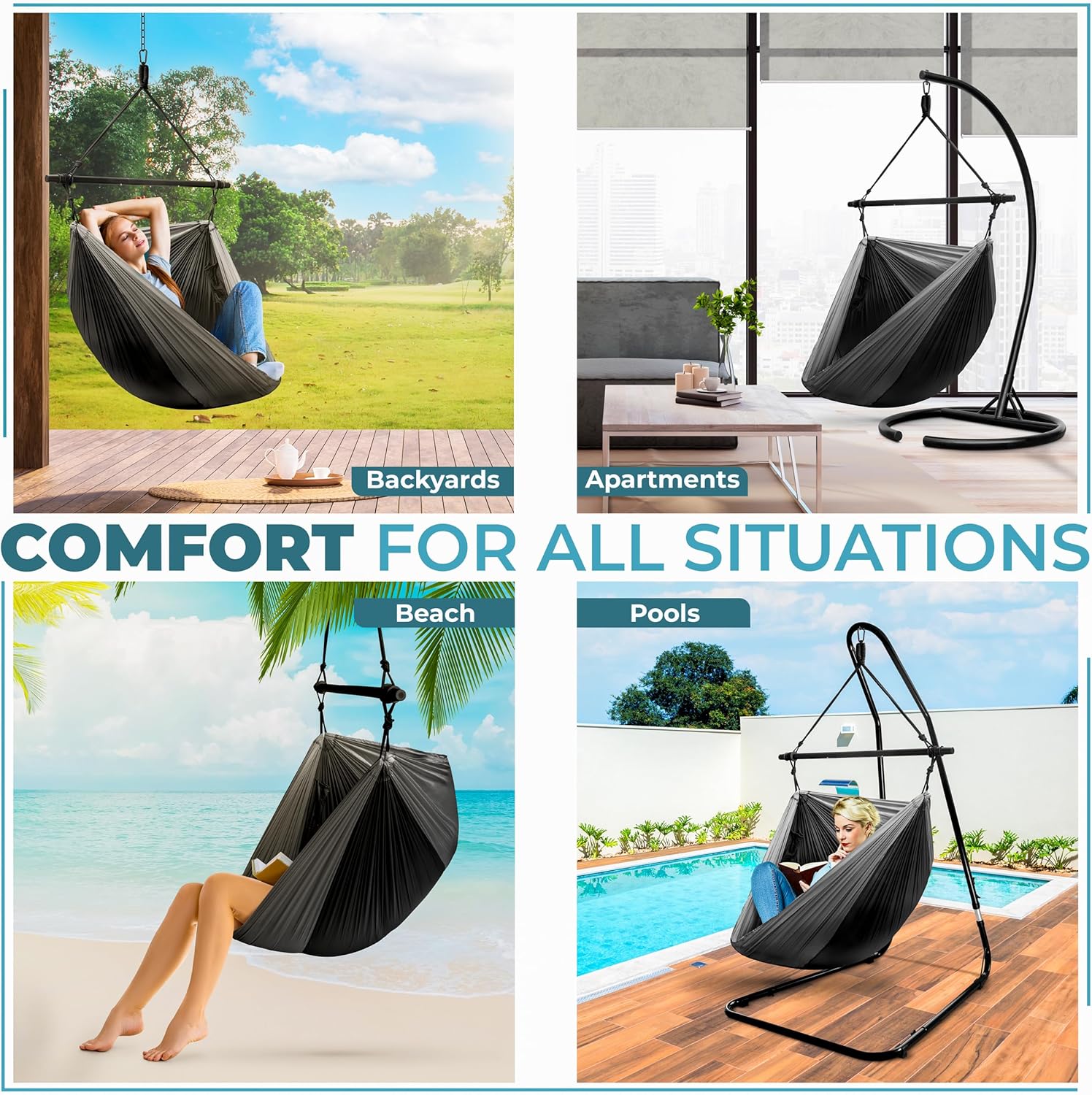 - Comfortable & Durable: Featuring durable woven ropes, sturdy nylon seat material, and an iron support rod, this outdoor hammock chair has a weight capacity of up to 500 pounds. Plus, the included metal anti-slip rings ensure the stability and balance of your hanging swing chair at all times!