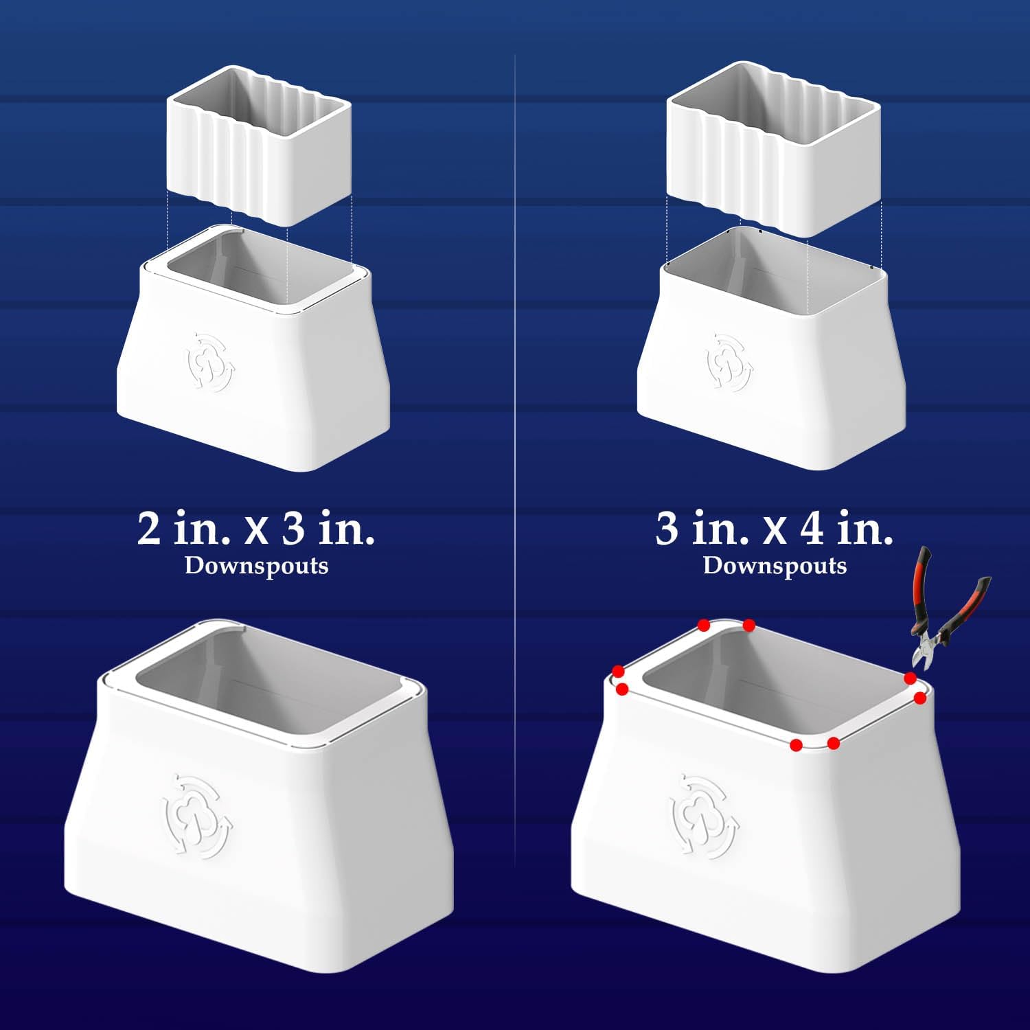 - Fits standard 2 in. x 3 in. or 4 in. x 3 in. downspouts.
