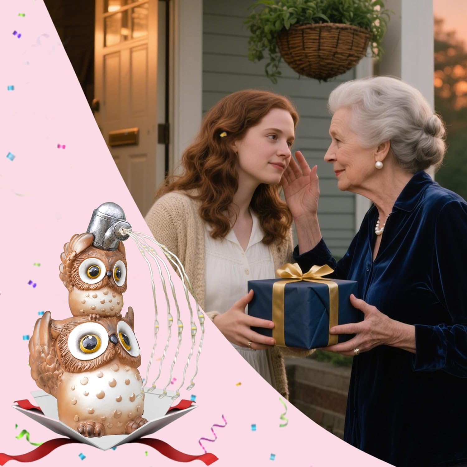 - Funny Owl Garden Statues:Charming owl decor feature a mother owl lifting her baby to water plants, adding warmth and joy to any outdoor space. The twinkling lights mimic flowing water cascading over flowerbeds and lawns, creating a magical effect. Perfect garden decorations for patios, porches, yards, balconies, fences, or walkways, enhancing your outdoor garden decor.