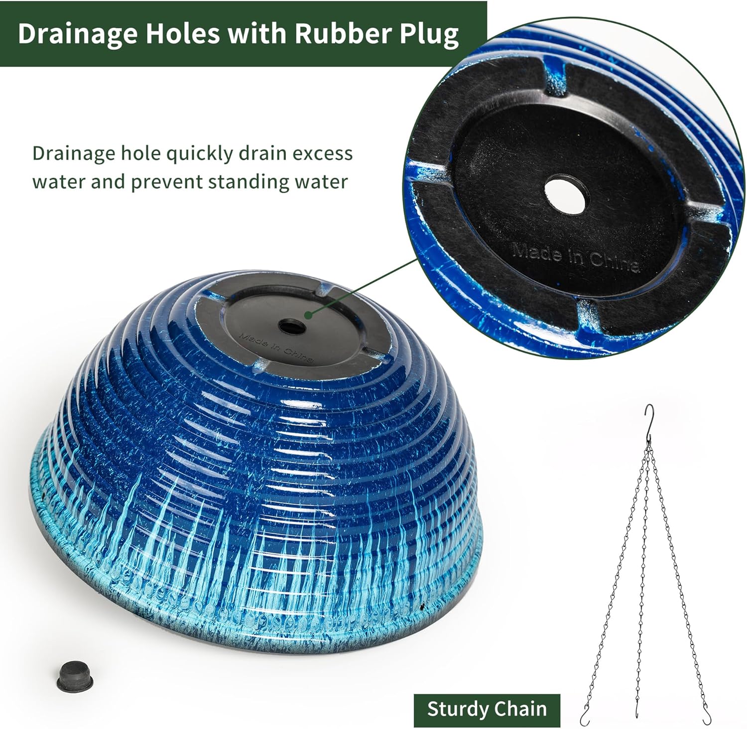 12 inch Large Hanging Planters for Indoor Outdoor Plants, Set of 2 Glazed Hanging Flower Pots with Drainage Hole, Hanging Baskets for Garden Home Porch Decor