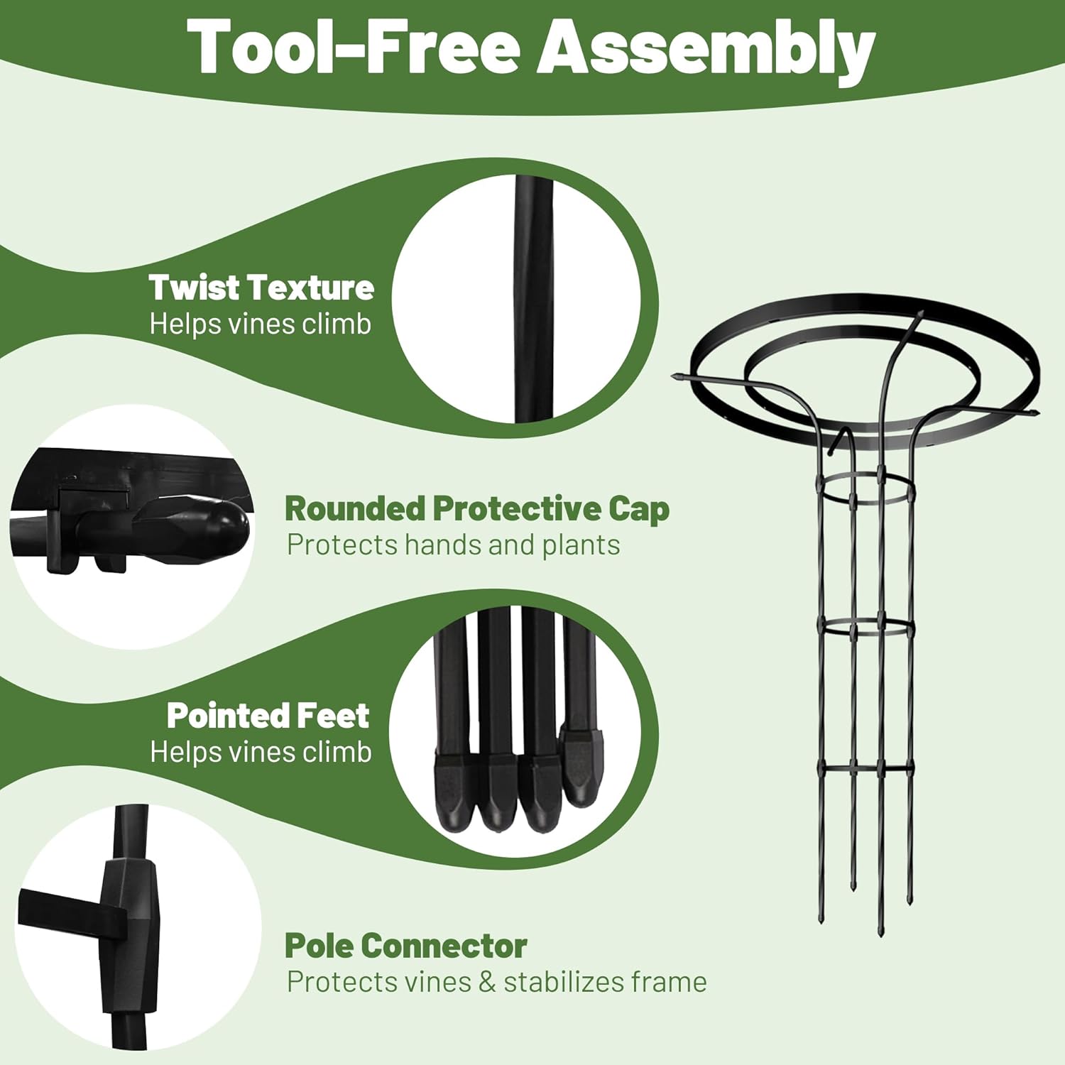 - Tool-Free Assembly - This mushroom-top round trellis comes with a manual for quick and hassle-free setup. No screws or special tools needed, just snap the parts together in minutes. Perfect for DIY gardeners and a smart upgrade from traditional tomato cages or bean trellises.