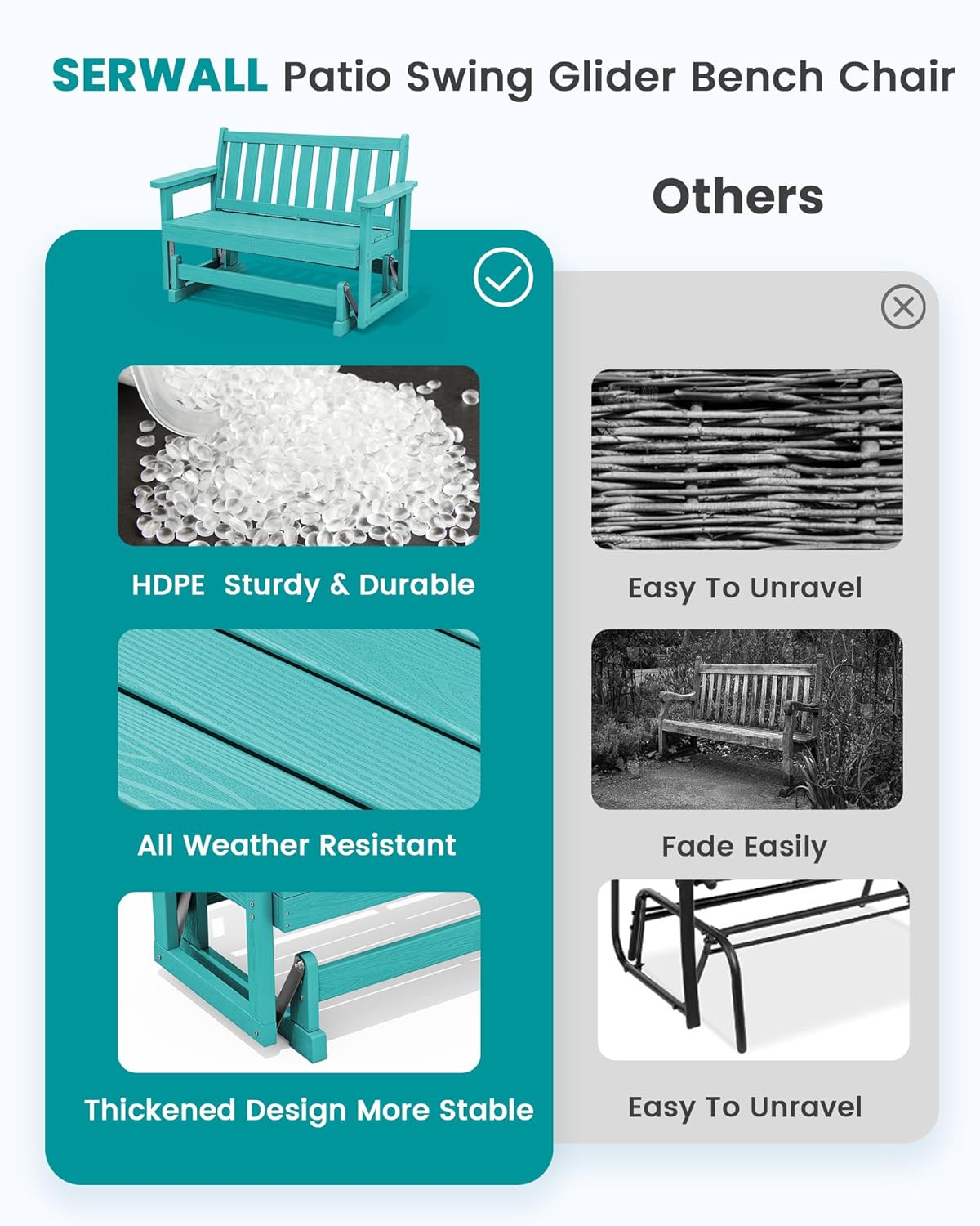 - [All Weather Resistant] Made with durable HDPE material and stainless steel hardware, the SERWALL glider rocking chair is built to withstand all weather conditions, ensuring long-lasting durability. The easy-to-clean surface and ability to swing add an extra level of comfort to your outdoor space, making it ideal for use in any outdoor setting.