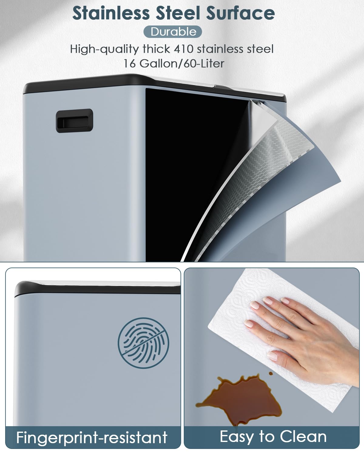 - Stainless Steel Outer &ABS Inner: Step trash can is made of 410 steel metal with a durable surface that is fingerprint-resistant, stain-resistant and easy to clean, you just need to wipe the surface of the trash cans with a damp cloth. Inner buckets are made of ABS material. And bucket is with pocket holes so that you can fix the plastic bags in place.